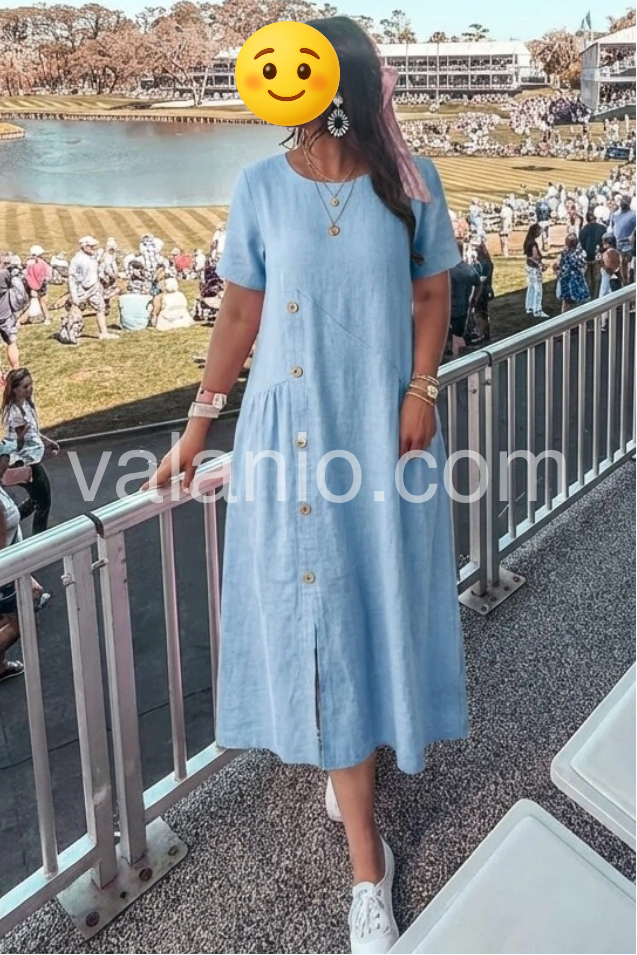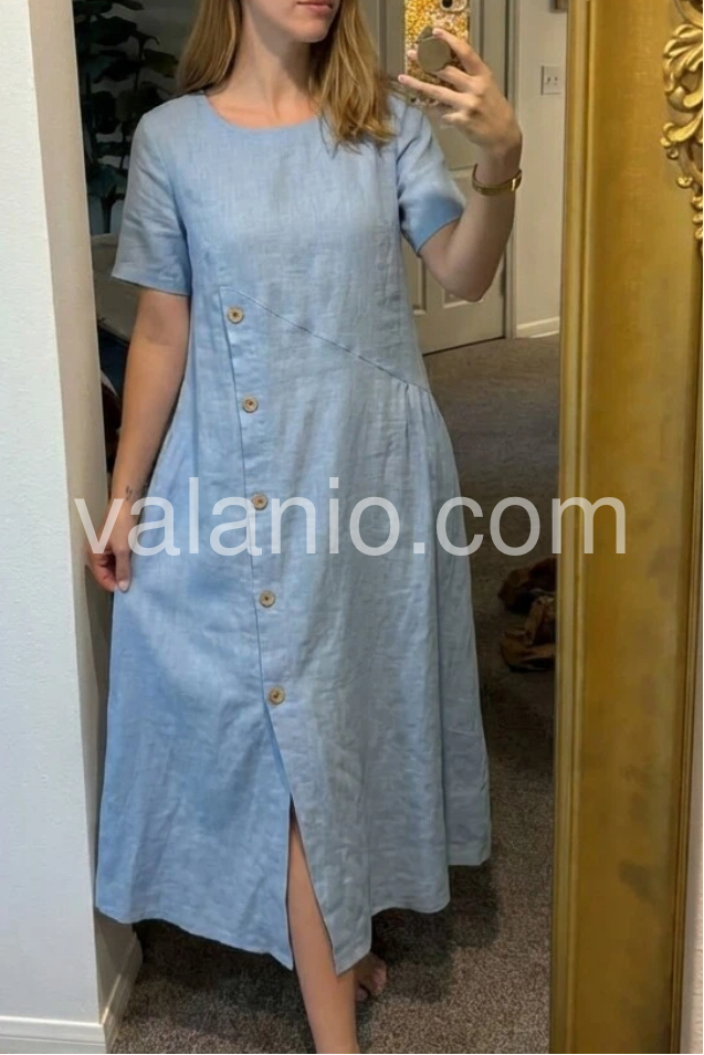 This flowing maxi dress features a soft blue linen fabric with a side button detail and front slit. Short sleeves and round neckline offer a simple, comfortable look. Functional pockets add practicality. Ideal for warm days or casual outings. Timeless style with a bohemian touch.