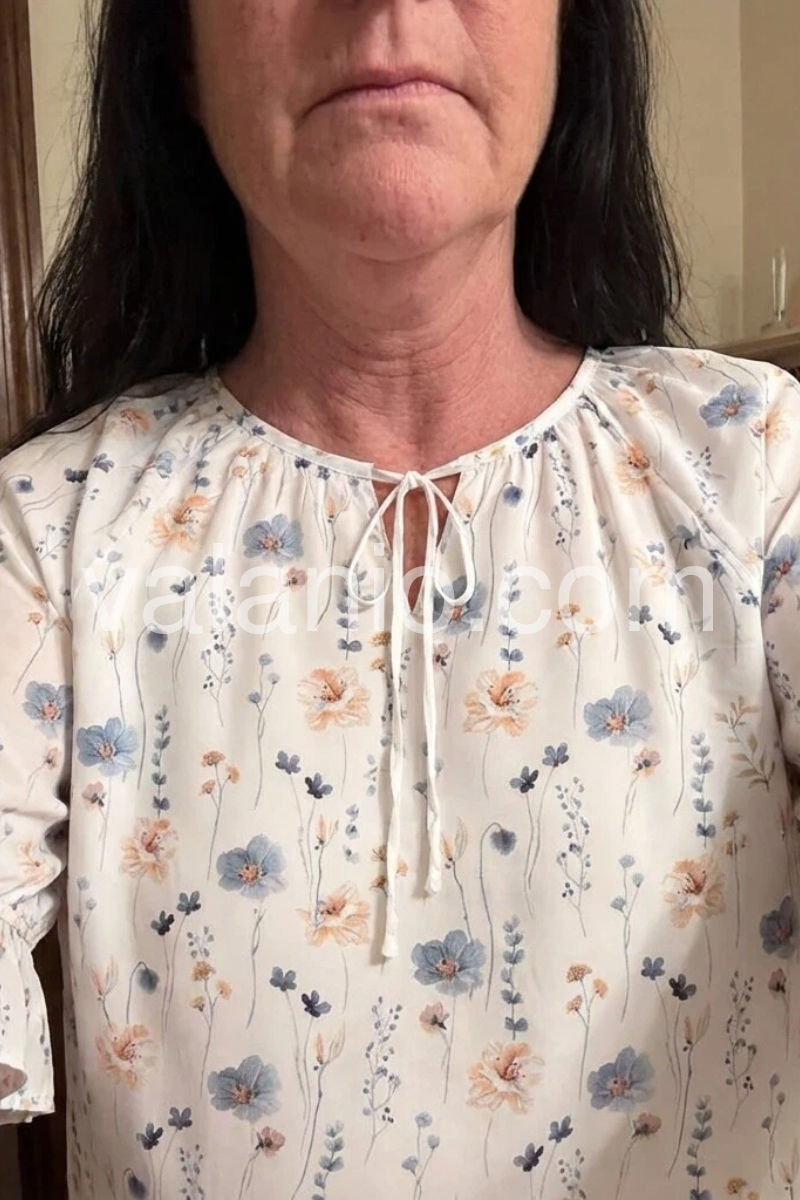 Thisloose-fit topfeatures a delicate floral print on a soft white base. Keyhole neckline with front tie adds a romantic touch. Three-quarter ruffle sleeves enhance the boho charm. Lightweight and perfect for spring or summer. Effortlessly stylish with jeans or skirts.