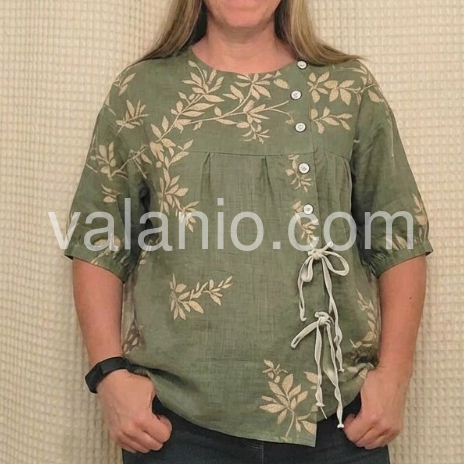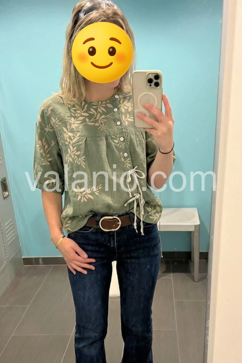 This loose-fit top features a soft olive green base with delicate leaf patterns. Front button-down design and side ties add a stylish touch. Short sleeves with rolled cuffs for comfort. Lightweight fabric perfect for casual wear. Effortlessly chic with a boho-vibe.