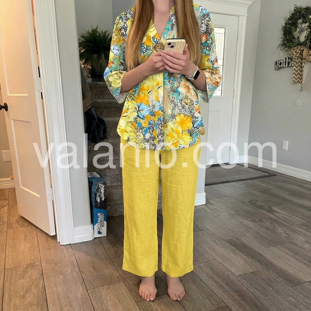 Perfect for my cruise! The fabric is so lightweight and breathable. The yellow floral top is incredibly vibrant, and the matching pants are flowy and comfortable. Got so many compliments.