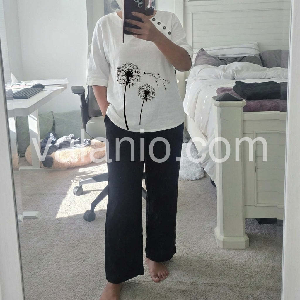 This is my new go-to weekend outfit. It looks put together but feels incredibly comfortable. The dandelion design is beautiful and the shirt drapes perfectly over the black trousers.