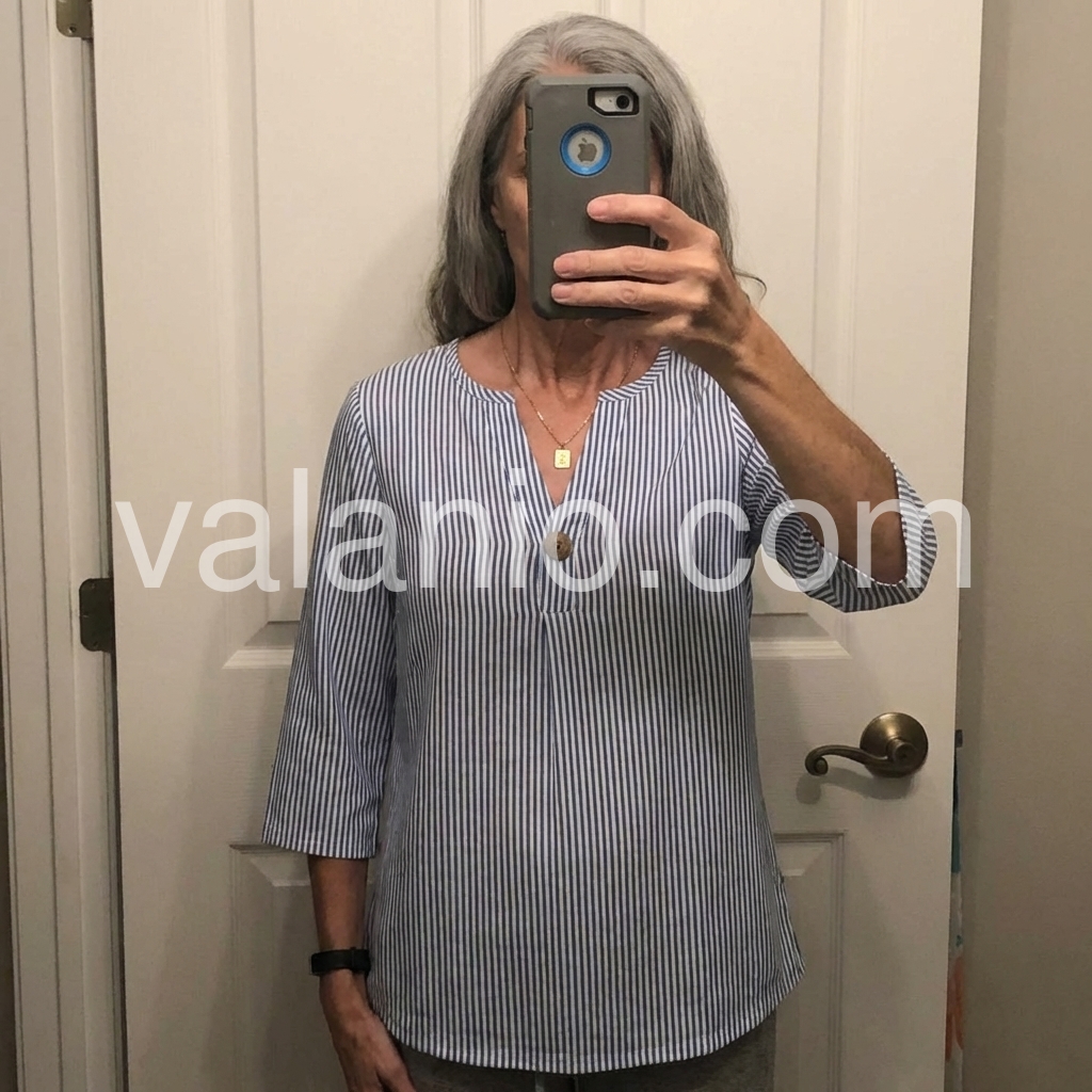 Very nice fabric. Quality made. Pretty stripped prints. Whether semi-dressy or casual, it is really nice. It has the right amount of coverage on my chest so that I can bend over doing gardening work or picking up my grandchildren. True to size.