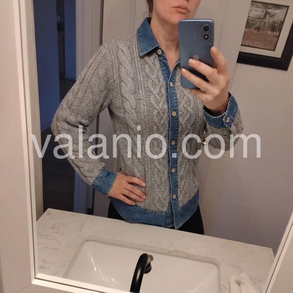 This top is such a great blend of comfy and fashionable. The light gray knit is soft-looking and the braided cable pattern gives it a premium feel. I also really like how the blue denim border stands out—it's flattering and adds personality without being too loud. Overall, it’s a perfect piece for everyday outfits.