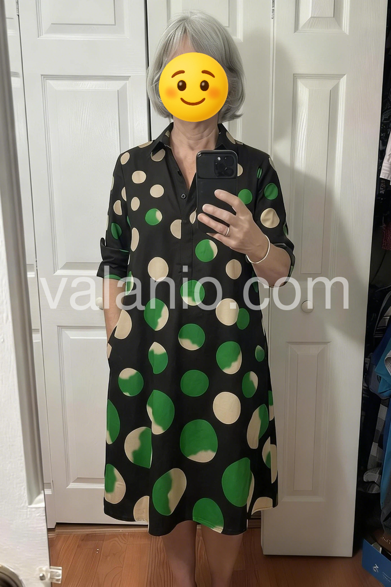 I bought this for a Mediterranean cruise and it was absolutely perfect! The fabric is lightweight and breathable, and the unique green and tan polka dots really stand out. Plus, it has pockets! Highly recommend for any summer vacation.