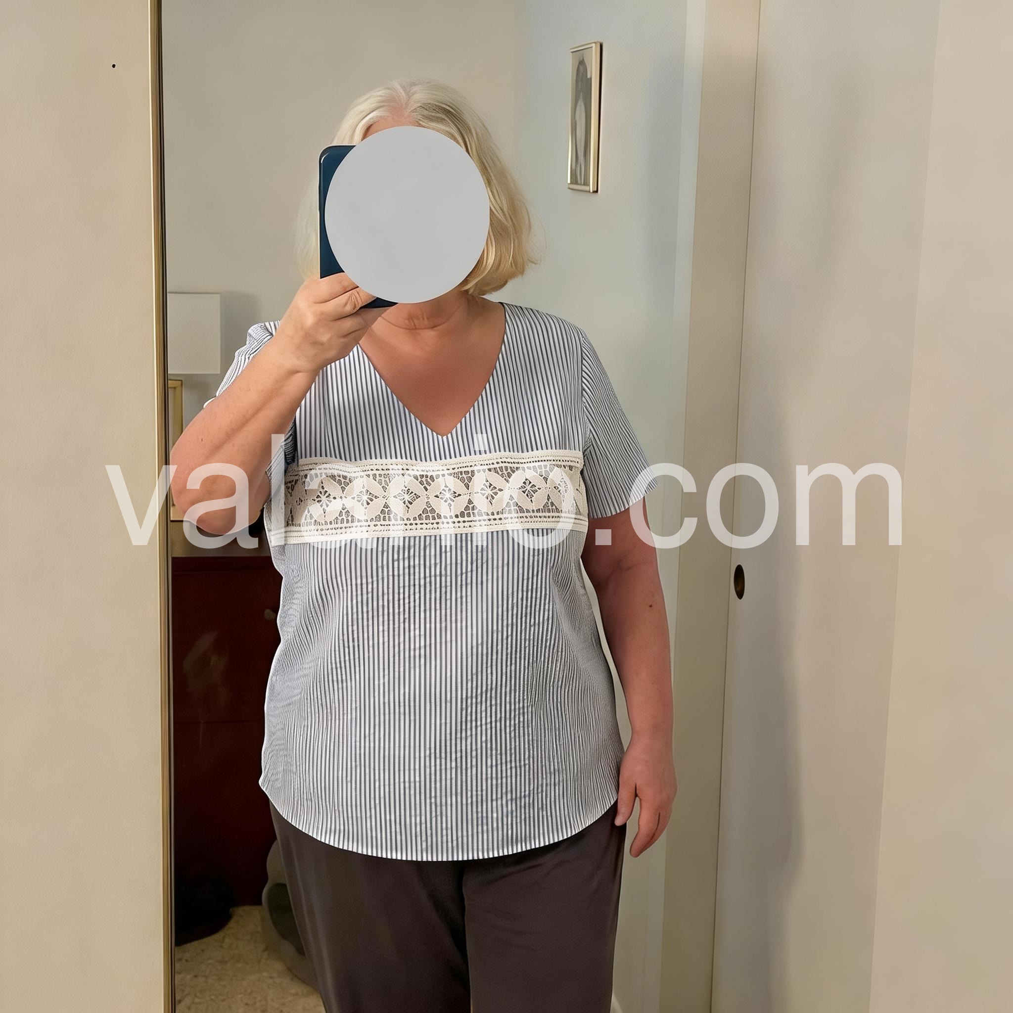 This relaxed-fit tee features light blue and white vertical stripes. A decorative white lace panel adds a delicate touch across the chest. Deep V-neckline and short sleeves for comfort. Lightweight fabric perfect for warm weather. Ideal for casual wear or beach outings.