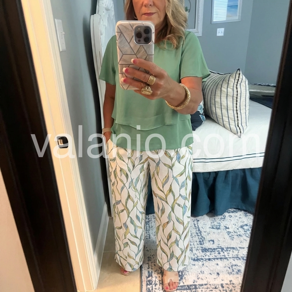 I bought this set for a summer cruise and it was absolutely perfect! The green layered top is very flattering and hides any tummy issues, while the leaf print pants are incredibly comfortable. Highly recommend for vacation wear.