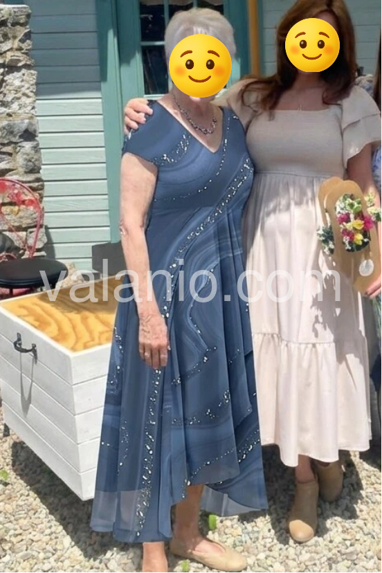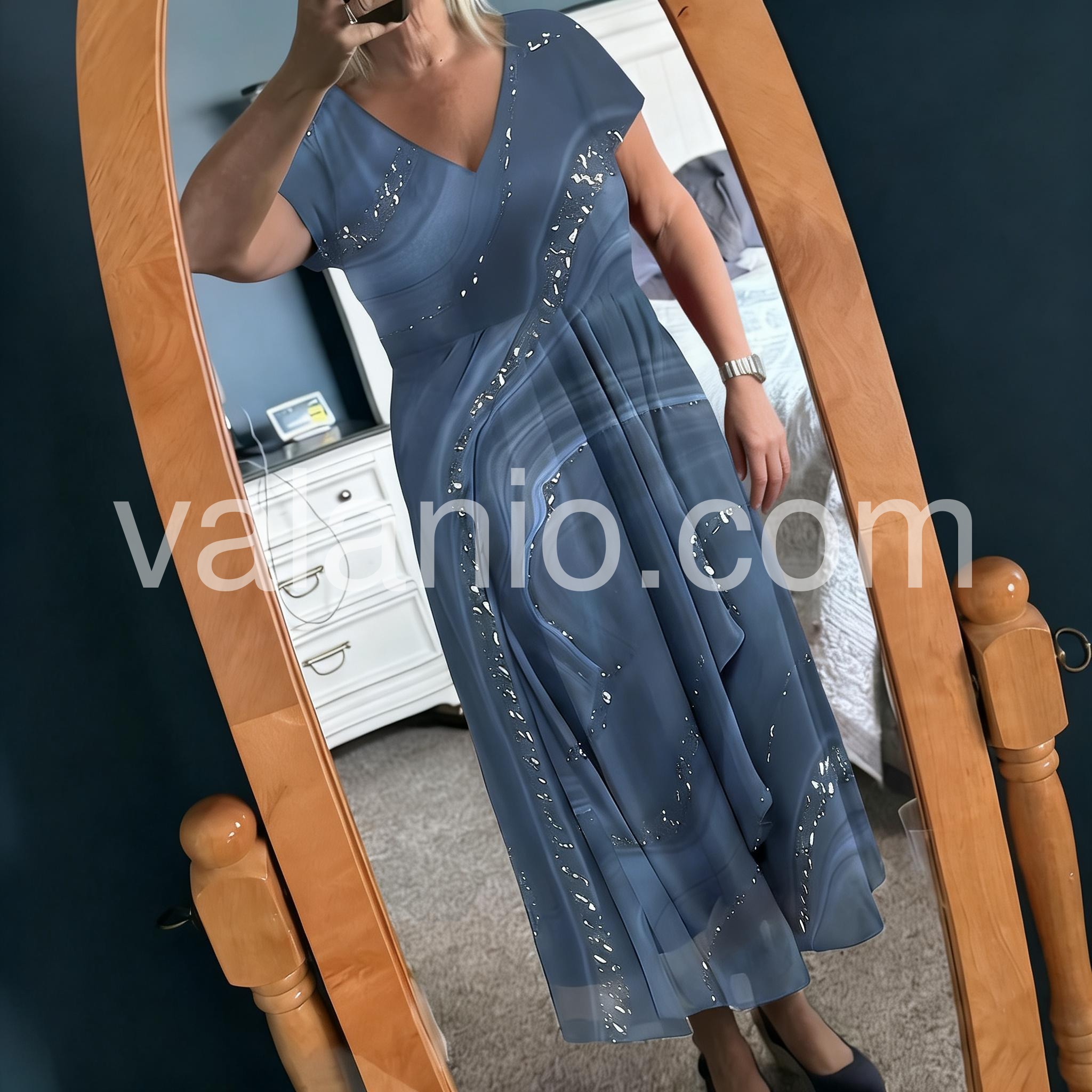 Thisflowy midi dress features a deep V-neck and cap sleeves with shimmering sequin details. The soft blue fabric drapes beautifully, creating a graceful silhouette. Perfect for evening events or special occasions. Lightweight and comfortable with a touch of sparkle. Timeless elegance with modern flair.