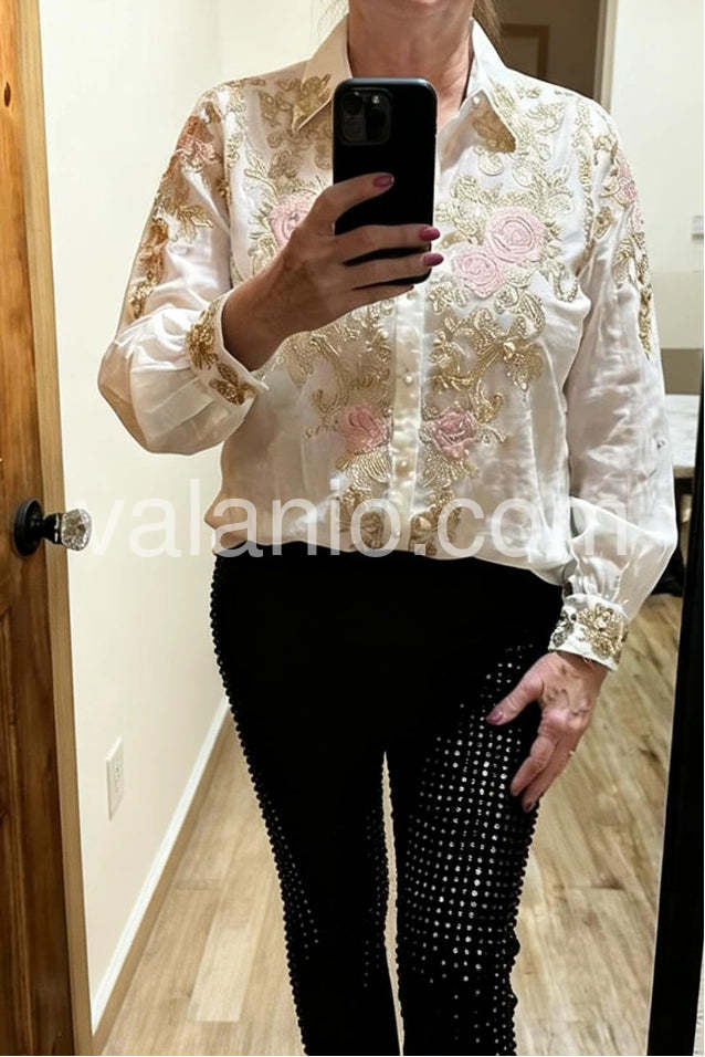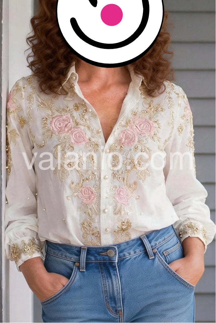 Beautiful crisp white shirt with stunning pastel pink roses. It elevates any outfit instantly. The fabric does not wrinkle easily, which is a huge plus for me. So happy with this purchase.