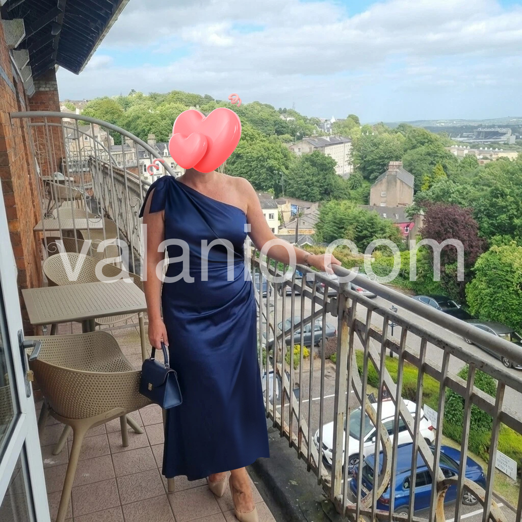 Love this dress! The color is beautiful, and the one-shoulder design looks so elegant. The fit is flattering and the slit makes it easy to walk in. Great quality and looks exactly like the photos.