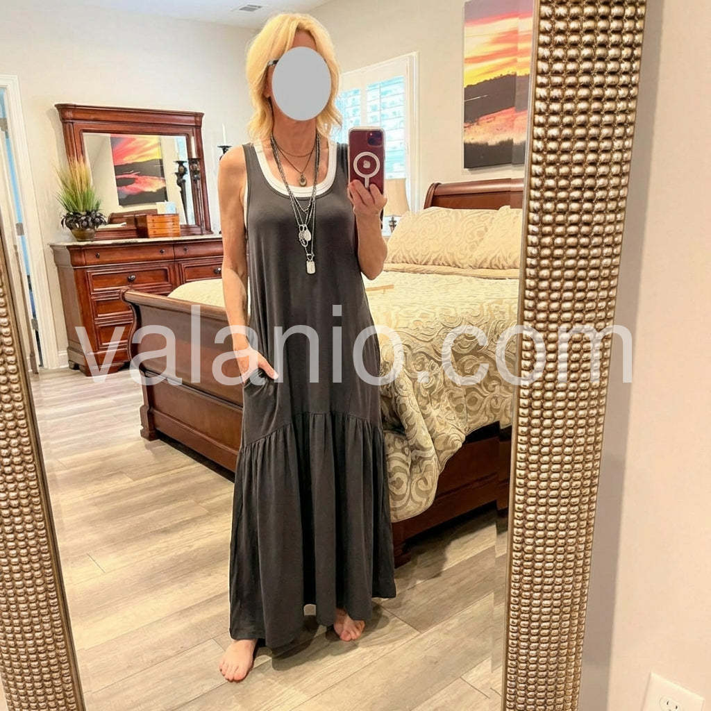 This understated yet chic sleeveless maxi dress embodies effortless comfort and modern simplicity. Crafted from soft, lightweight fabric—likely jersey or cotton blend—it features a relaxed, straight-cut silhouette that flows gracefully to the floor. The dress is accented with a clean white trim around the scoop neckline, adding a subtle contrast to its rich dark gray hue. A tiered hemline enhances movement and adds visual interest, while two large side pockets offer both practicality and a casual touch. Perfect for laid-back days, beach outings, or summer evenings, this versatile piece pairs beautifully with sandals, layered necklaces, and woven bags. Its minimalist design makes it ideal for layering or wearing alone, exuding calm confidence and timeless appeal. A wardrobe essential for anyone who values comfort, style, and ease in their everyday fashion.