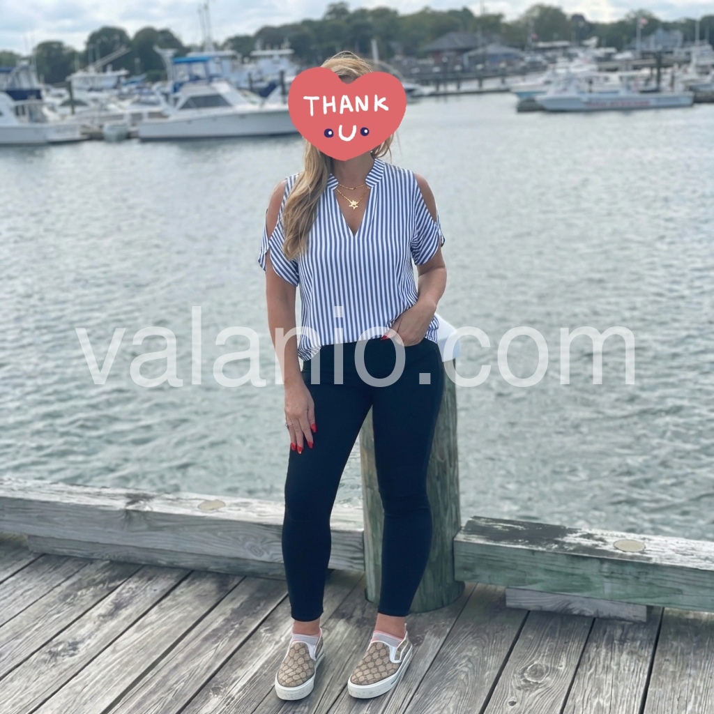 I absolutely love this top! The vertical stripes are so flattering and it fits perfectly. The material is very lightweight and breathable, making it perfect for summer. I paired it with my favorite jeans and got so many compliments.