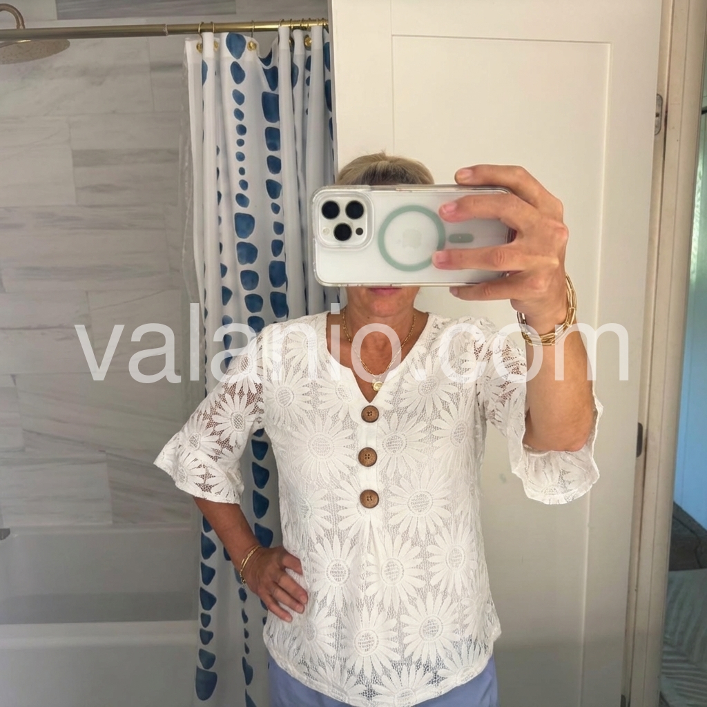 I absolutely love this top! The daisy lace pattern is so cute and perfect for spring. It fits true to size and looks great with my favorite pair of jeans. Highly recommend!