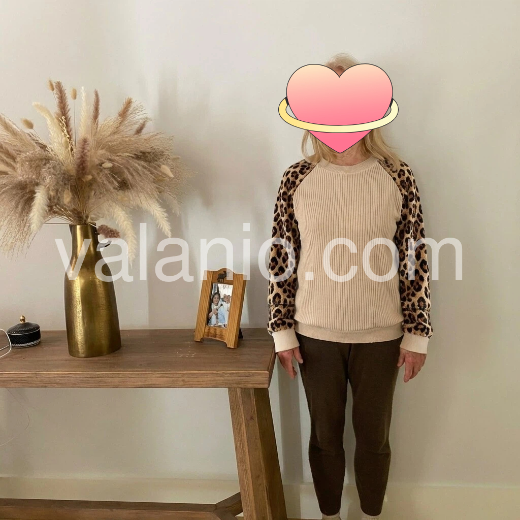 I really love this top! The beige knit is soft and comfortable, and the leopard print sleeves add a fun, stylish touch. The fit is flattering and the fabric feels well made. It’s great for fall layering and looks just like the photos.
