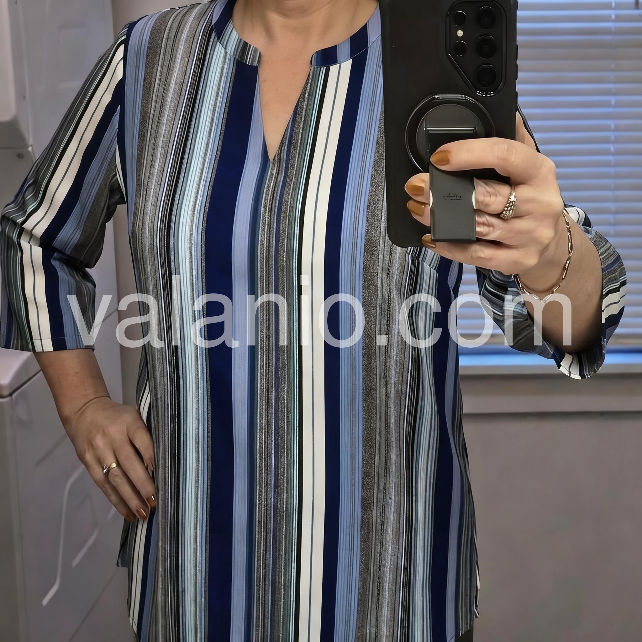 This loose-fitting top features vertical stripes in navy, blue, white, and gray for a modern look. The V-neck design adds a touch of elegance. Three-quarter sleeves with rolled cuffs offer comfort and style. Perfect for pairing with jeans or pants. Effortlessly chic for everyday wear.
