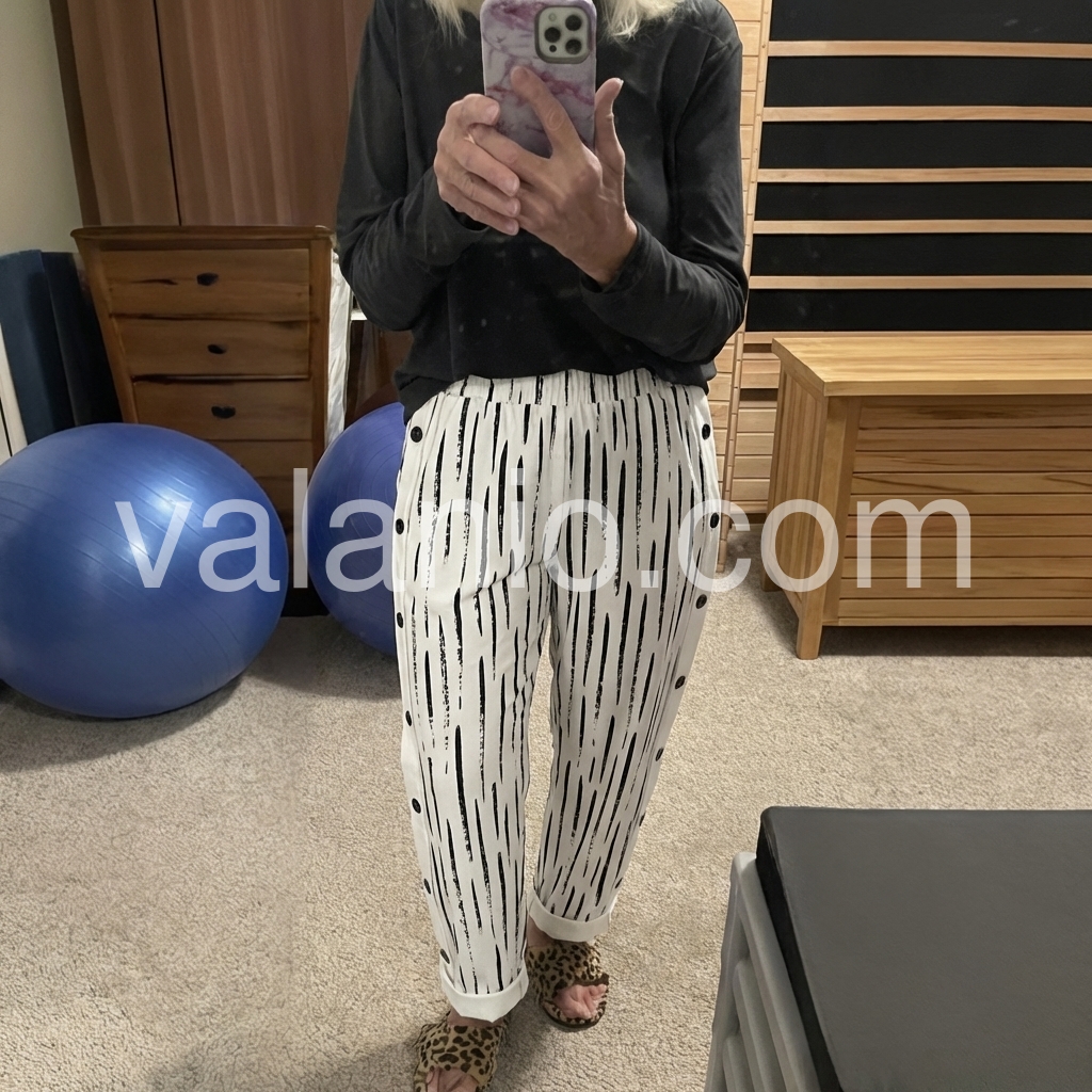 These pants are absolutely amazing! The black and white brushstroke pattern is so chic, and the elastic waist makes them incredibly comfortable for all-day wear. I love the side button details, it adds such a unique touch. Highly recommend for a stylish summer outfit!