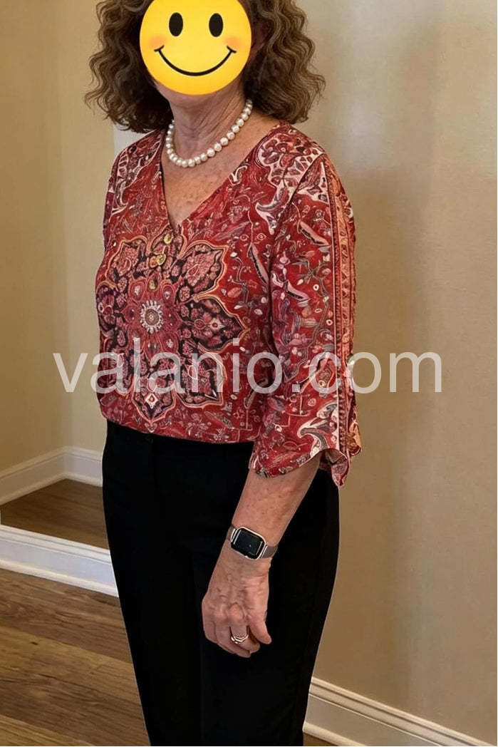 A vibrant bohemian blouse featuring an intricate red paisley print. This elegant top showcases a classic V-neckline adorned with delicate buttons, adding a touch of sophistication. The three-quarter length flared sleeves create a flowy, feminine silhouette, perfect for both casual outings and more dressed-up occasions. Crafted from lightweight, breathable fabric, it ensures comfort all day long.