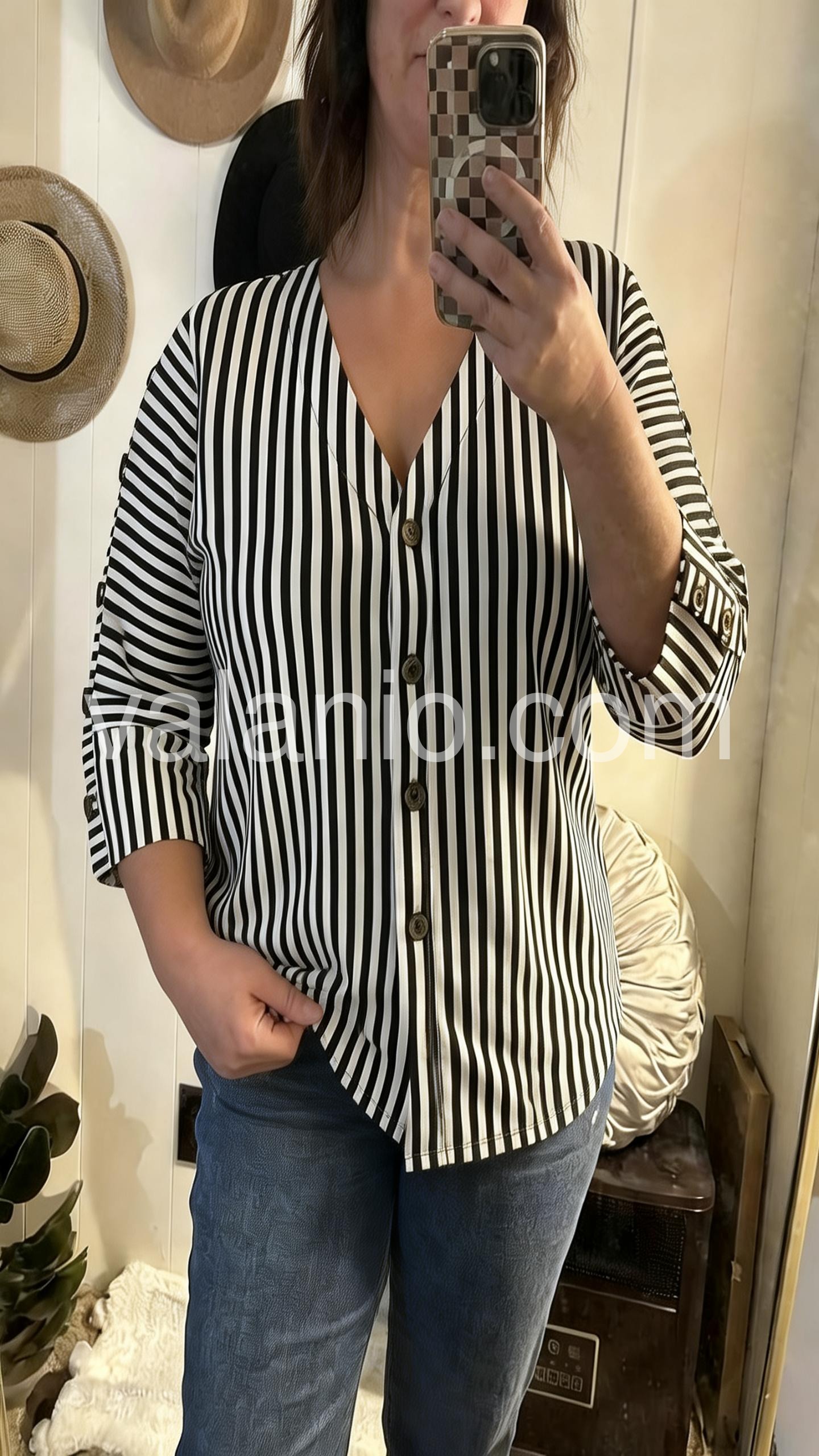 This button-down blouse features bold vertical stripes and a flattering V-neckline. Three-quarter sleeves with buttoned cuffs add a polished touch. Lightweight fabric perfect for casual or office wear. Ideal for pairing with jeans or trousers. Timeless style with modern flair.