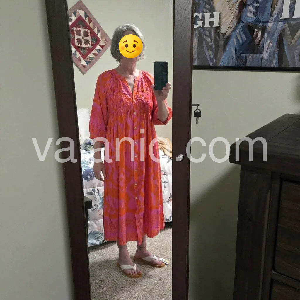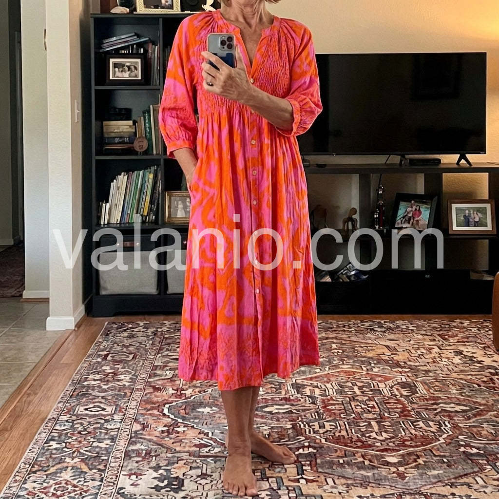 This super-glam hot pink and orange print midi dress is all you need to make a style impression, featuring a round v-neck collar, buttons down the front, and a shirred flattering top. Three-quarter length sleeves provide coverage and versatility to this everyday sophisticated blouse dress. Machine wash cold tumble dry low to mediumheat. Iron if needed or lay flat to dry.