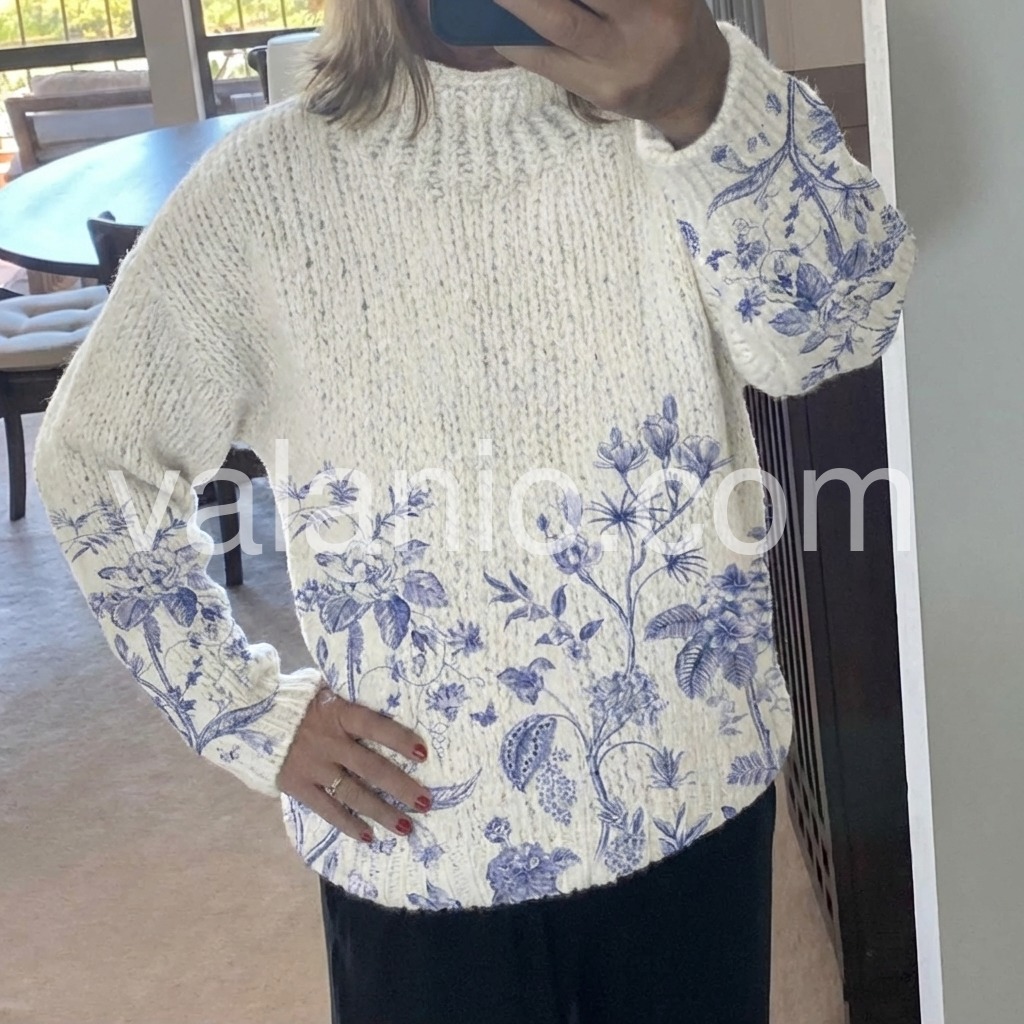 This sweater is so cute on! I love the flower details and how it feels on. It's soft and has stretch to it. It washes up great and keeps it shape. It's true to size and and pilling. It will keep you pretty warm as well - not thin and not see through. It's a great stylish sweater to have in the collection.