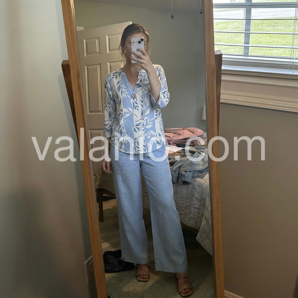 I bought these pants for an upcoming vacation, and I'm so glad I did. They are lightweight, comfortable, and the light blue shade is beautiful. They pair perfectly with the matching top.