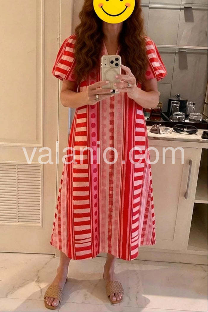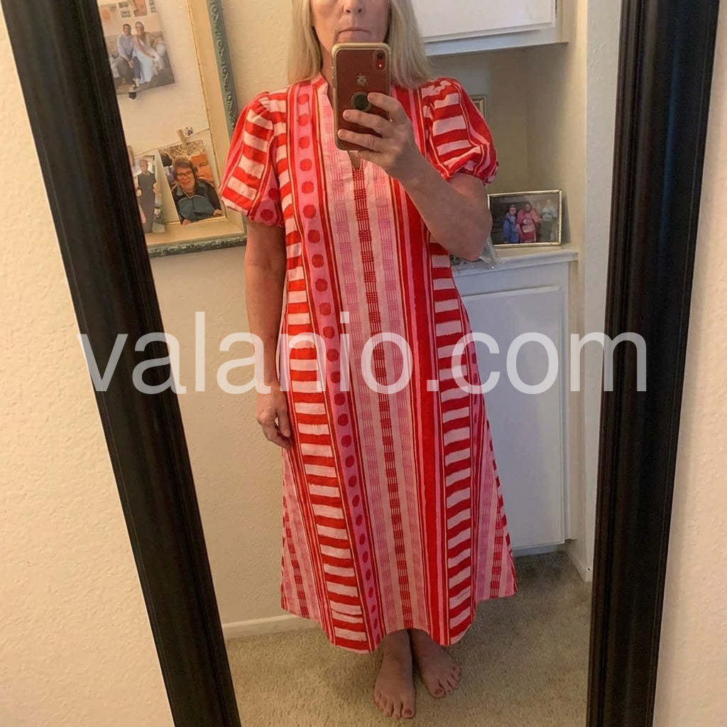 This eye-catching midi dress radiates joy and confidence with its bold, playful pattern of vertical stripes in varying shades of red, pink, and white, accented with polka dots and checkered details. Crafted from lightweight, breathable fabric—perfect for warm days—it features a flattering V-neckline and charming puff sleeves that add a touch of vintage flair. The relaxed A-line silhouette drapes beautifully, offering comfort and movement while creating a flattering shape. Ideal for casual outings, beach days, or vibrant summer events, this dress effortlessly combines fun patterns with timeless style. Paired with simple sandals and gold accessories, it makes a statement without overpowering. Whether you're strolling through the city or enjoying a garden party, this dress brings energy and elegance to every moment. A joyful celebration of color and fashion for those who love to stand out with cheerful confidence.