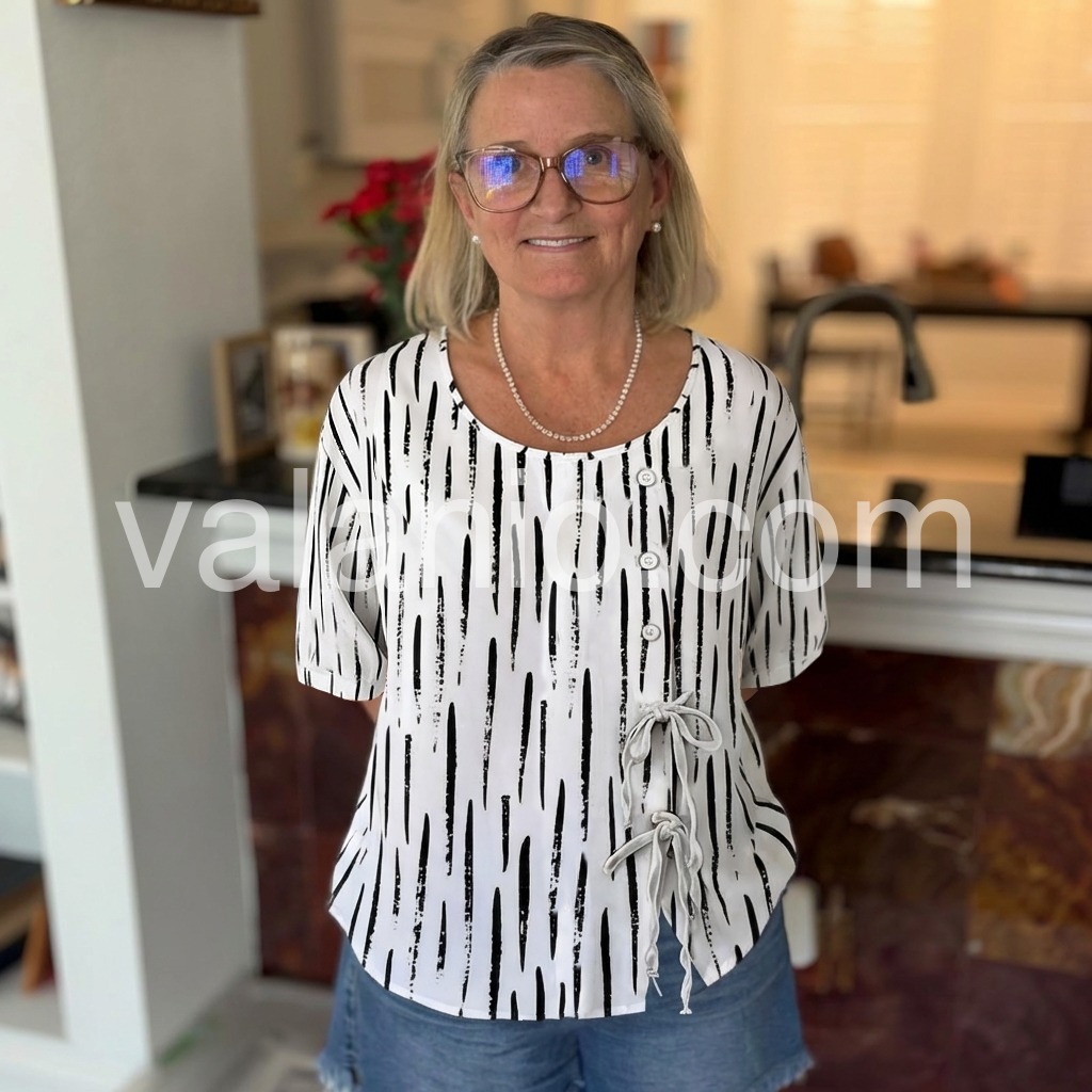 This relaxed-fit blouse features a bold black abstract stripe print on a white base. Round neckline with front button closure and side tie details. Lightweight fabric perfect for everyday wear. Ideal for pairing with jeans or leggings.