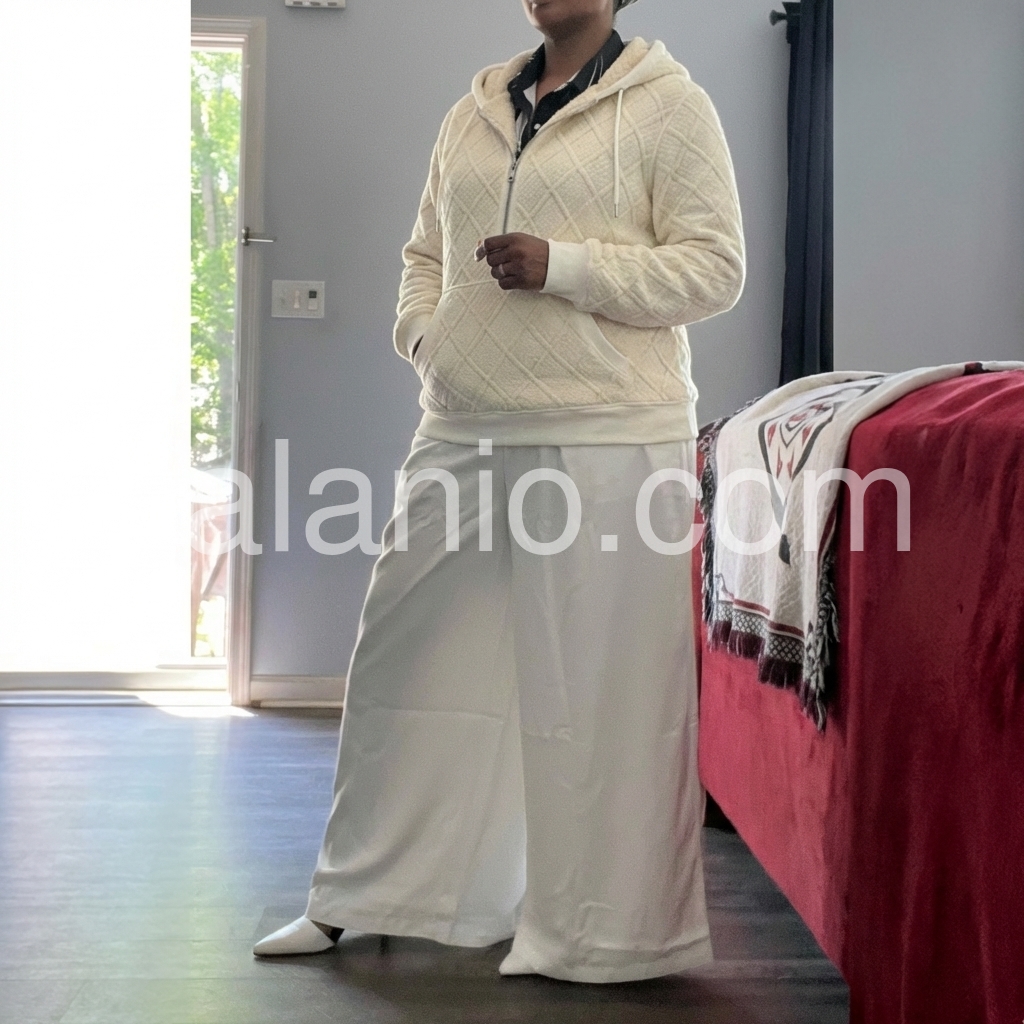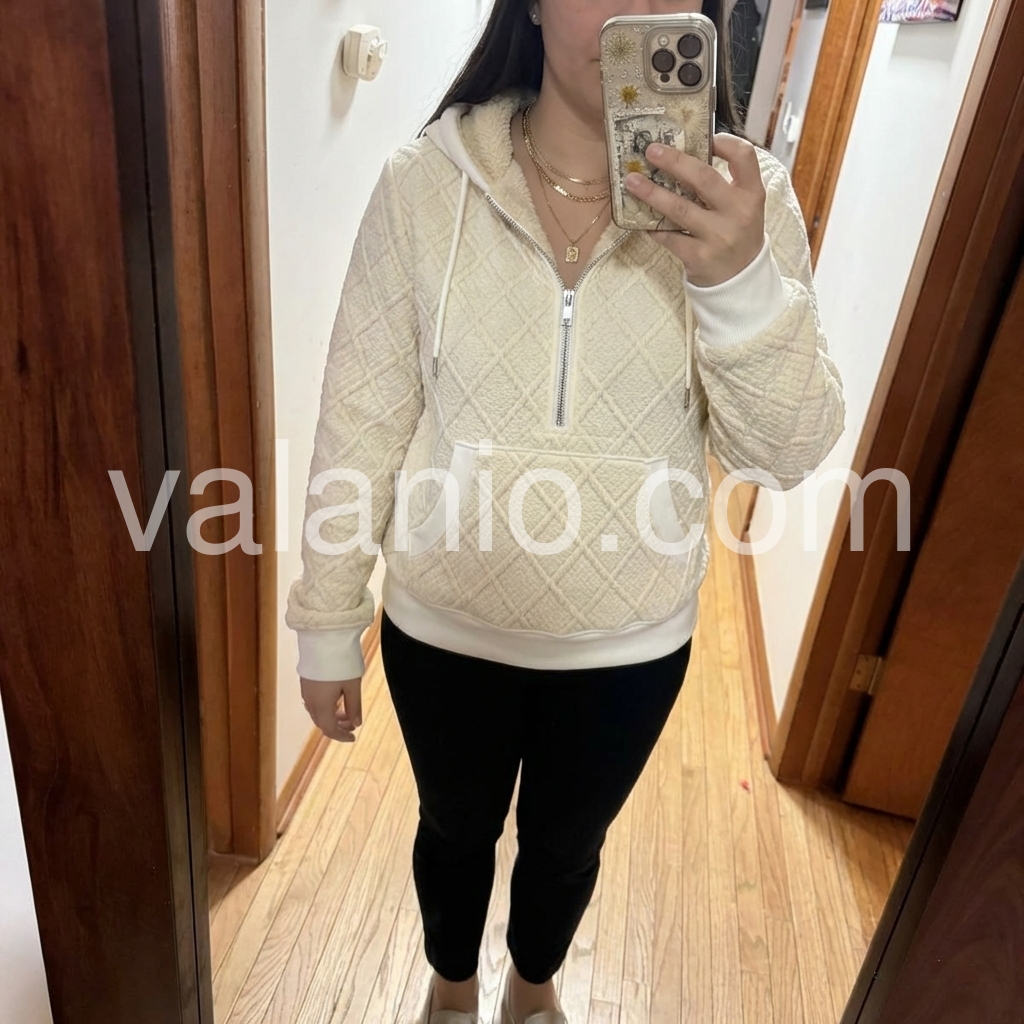The quality of this hoodie sweater surprised me. The stitching and quilted diamond design are neat and well-made, and the fit feels flattering without being too tight. I also appreciate the zipper and kangaroo pocket; they make it practical for everyday wear while still looking fashionable.