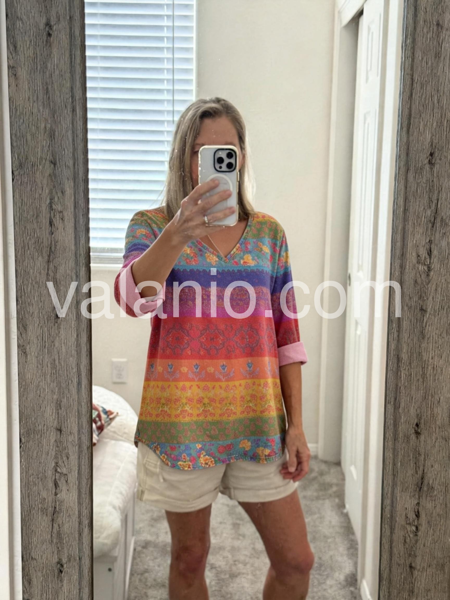 Great casual top! I love that the sleeves can be rolled up to 3/4 length. The colors are beautiful and bright, making it a perfect transition piece from summer to fall.