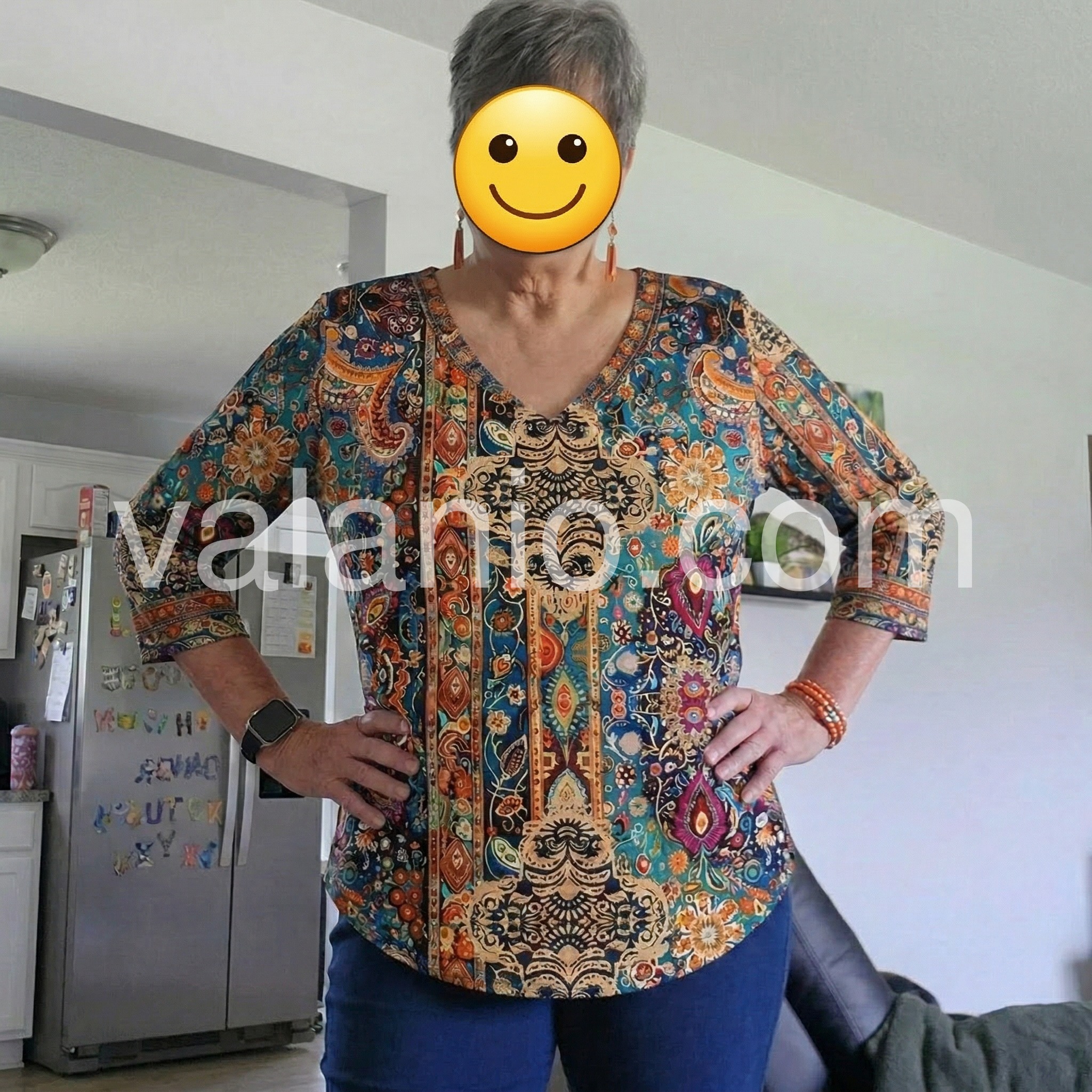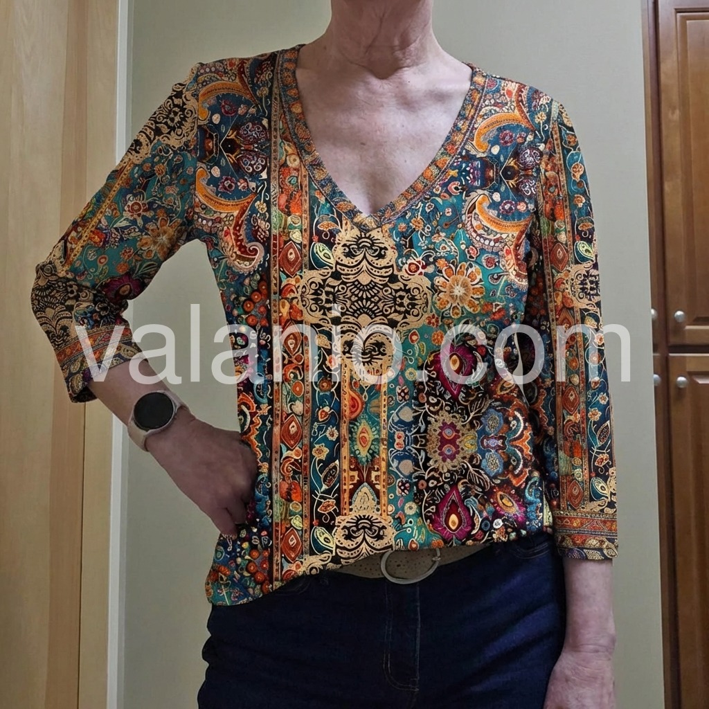 Beautiful blouse. I receive so many compliments every time I wear it. The V-neck is flattering without being too low, and the print is very unique. It washes well without fading.