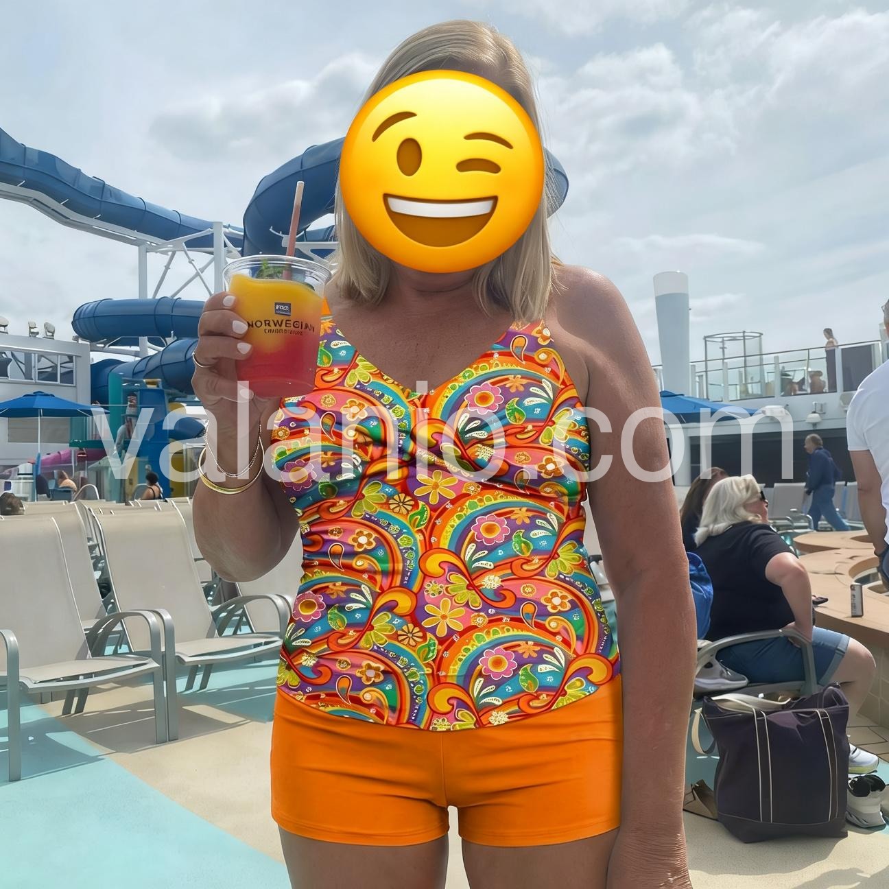 This swimsuit is beautiful and exactly as pictured, the suit design is awesome and really helps hold in and hide a belly, and is very comfortable. And at first I got tons of compliments. Fits true to size.