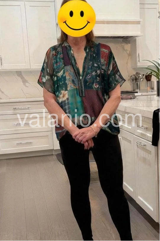 This captivating bohemian blouse is a vibrant celebration of eclectic style, featuring a patchwork design that blends rich floral patterns, vintage-inspired prints, and bold color blocks in deep greens, reds, blues, and earthy tones. Crafted from lightweight, semi-sheer fabric—likely chiffon or silk blend—it drapes softly for a relaxed, airy feel perfect for warm weather. The deep V-neckline adds a touch of allure, while the short flutter sleeves enhance its free-spirited charm. With a subtle button placket down the front and an asymmetrical hem, this top effortlessly combines artistry and comfort. Paired with high-waisted denim jeans and layered jewelry, it creates a laid-back yet stylish look ideal for beach days, festivals, or casual outings. A true statement piece that channels boho elegance and creative flair—perfect for those who love to express their individuality through fashion.
