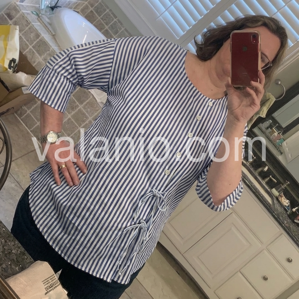 I absolutely adore the tie and button details. It takes a classic striped shirt and makes it trendy. I will definitely be looking to buy more colors if available.