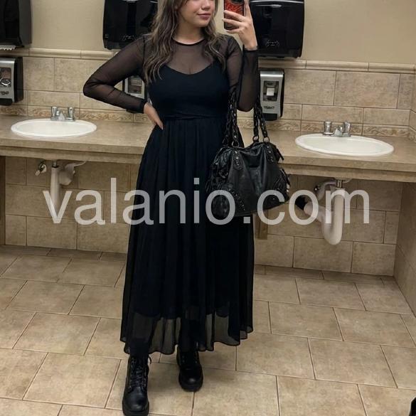 Absolutely in love with this dress! The sheer mesh sleeves give it such a cool, edgy vibe without being too revealing. I wore it to a concert with chunky combat boots just like the model, and it looked incredible. The material is surprisingly soft and flows beautifully when you walk.