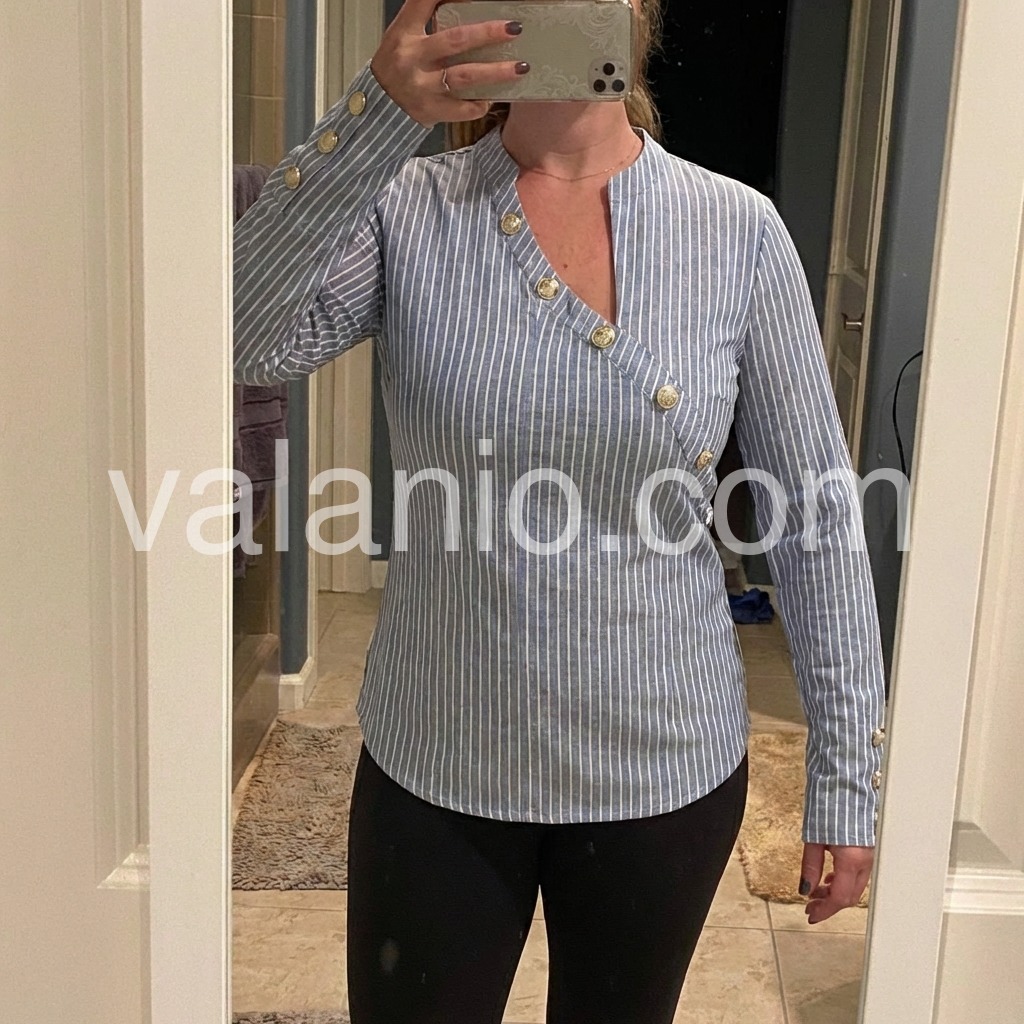 Such a versatile piece. You can easily dress it up for a meeting or wear it casually with jeans. The vertical stripes are very slimming and the sleeve buttons add a nice touch of luxury.