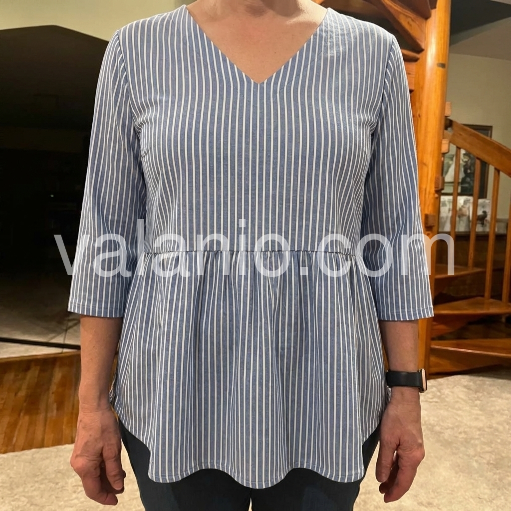 This relaxed-fit tunic features vertical blue and white stripes with a soft V-neckline. Three-quarter sleeves with rolled cuffs for a casual look. Gathered waist creates a flattering silhouette. Lightweight fabric perfect for everyday wear. Ideal for pairing with jeans or leggings.