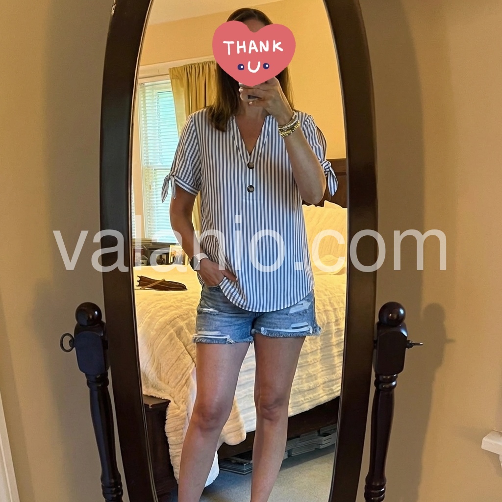 Absolutely love this top! The vertical stripes are so flattering and the little ties on the sleeves add such a cute detail. It fits perfectly and looks great with jeans. Very lightweight and perfect for summer.