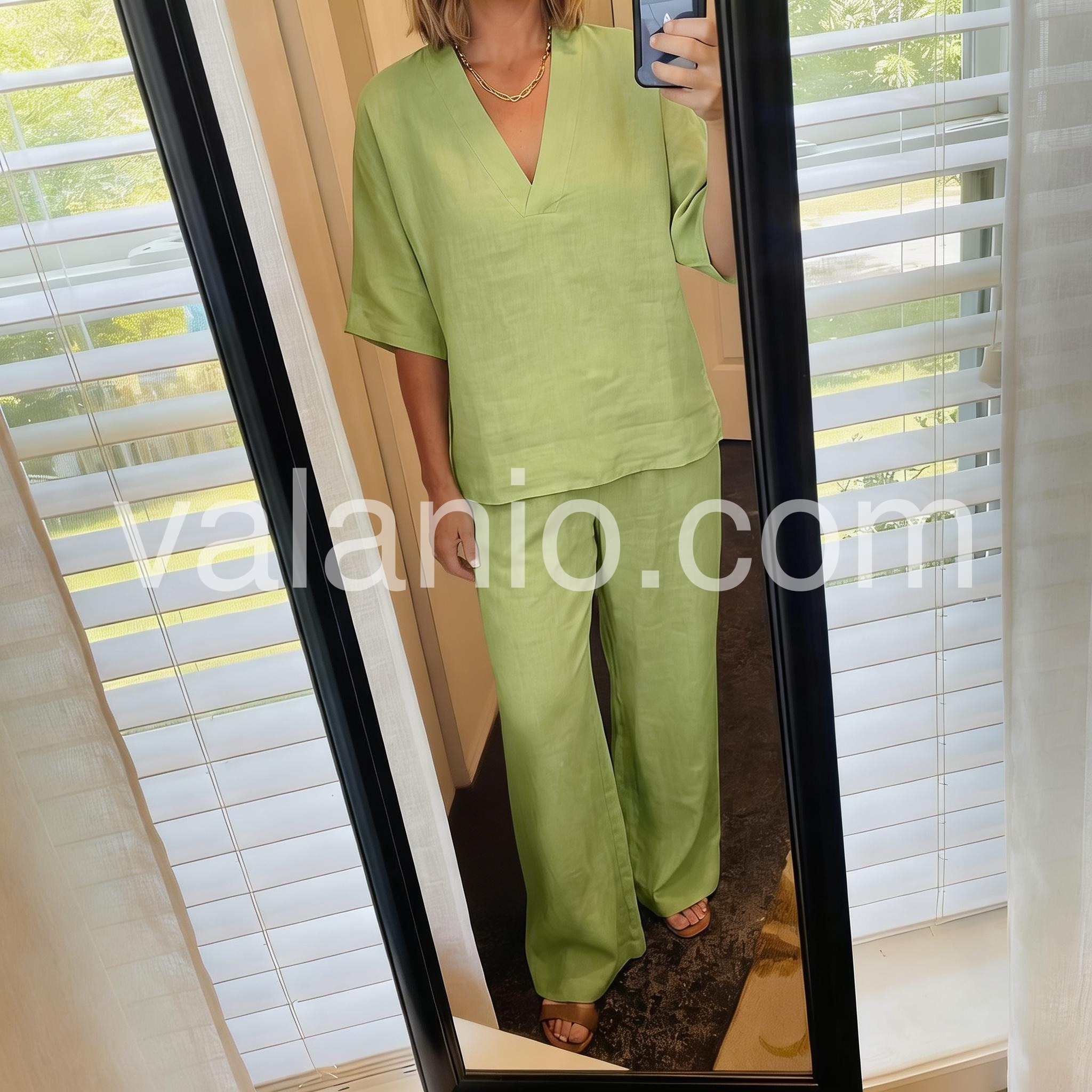 This coordinated set features a relaxed V-neck top and wide-leg pants in soft, breathable linen. The solid lime green hue offers a fresh, natural look. Perfect for warm weather and casual wear. Ideal for beach days or effortless everyday style. Comfortable and elegantly simple.