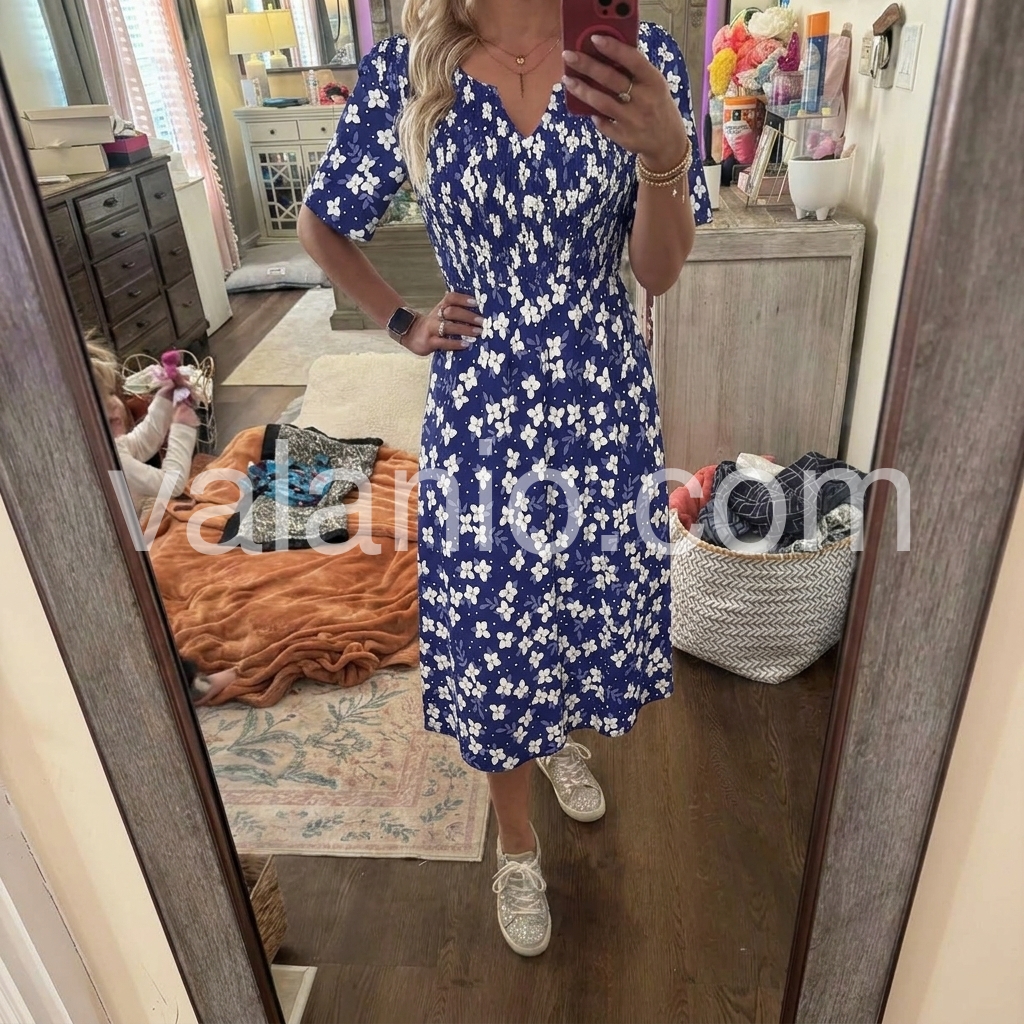 This dress solves the “cute but comfortable” dilemma with ease. The ditsy white floral print on a navy base feels fresh and summery, while the smocked waist creates a flattering silhouette. The gathered detail cinches the waist without feeling tight.