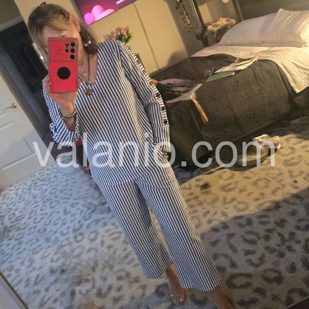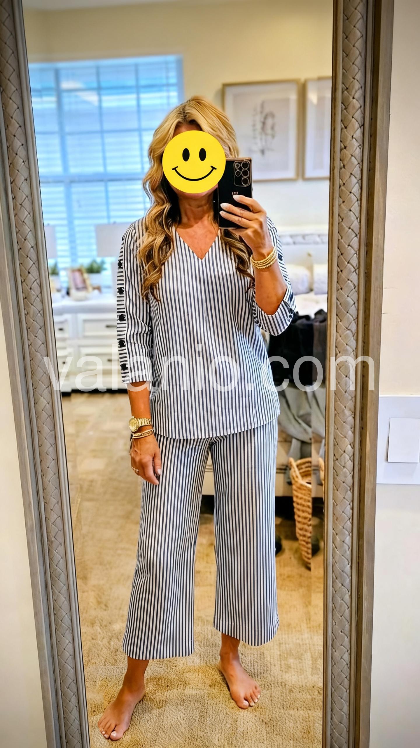 This coordinated setfeatures a relaxed V-neck top and wide-leg cropped pants in classic blue and white stripes. The long sleeves with decorative side buttons add a stylish detail. Lightweight fabric perfect for warm weather. Ideal for casual outings or smart-casual events. Effortlessly elegant and easy to wear.