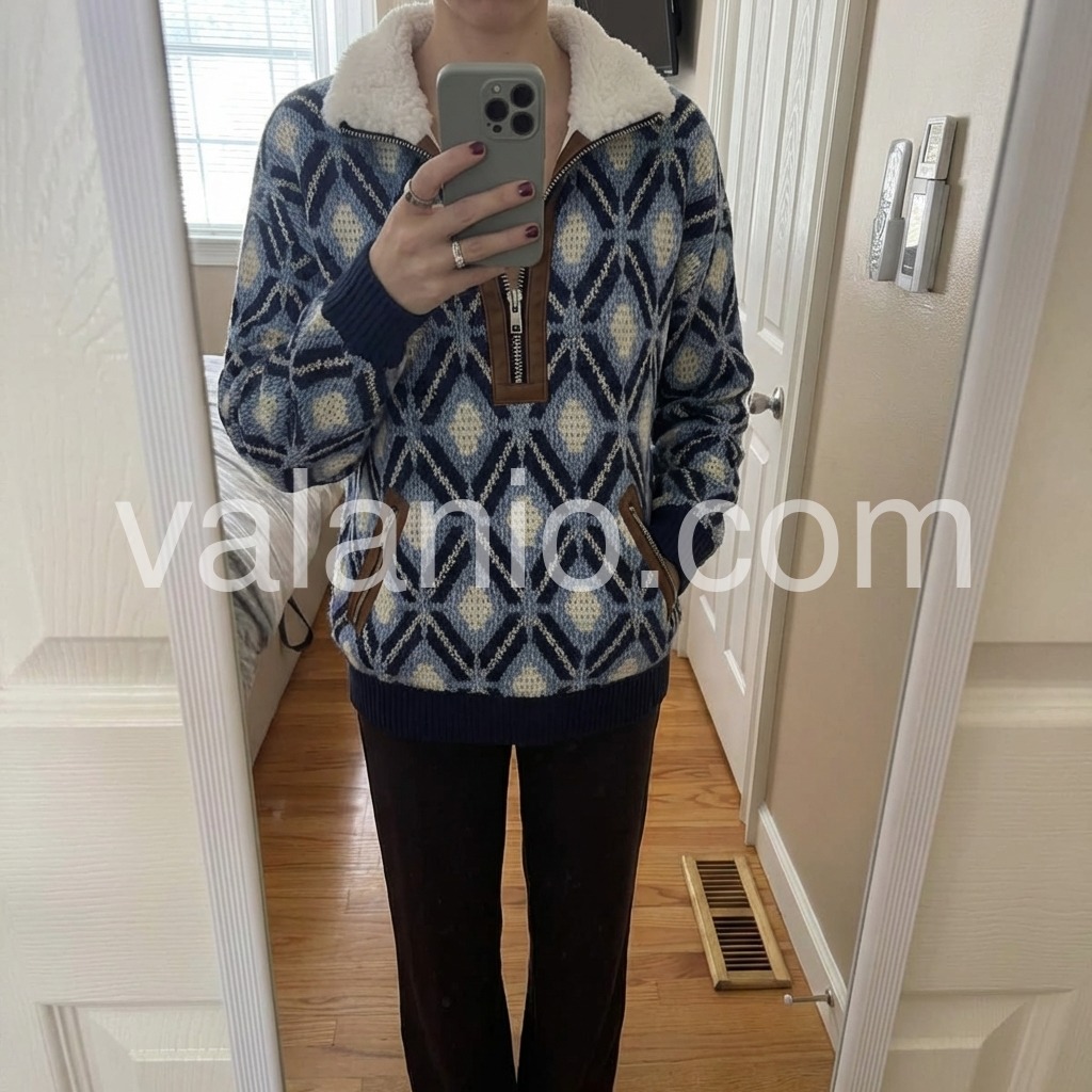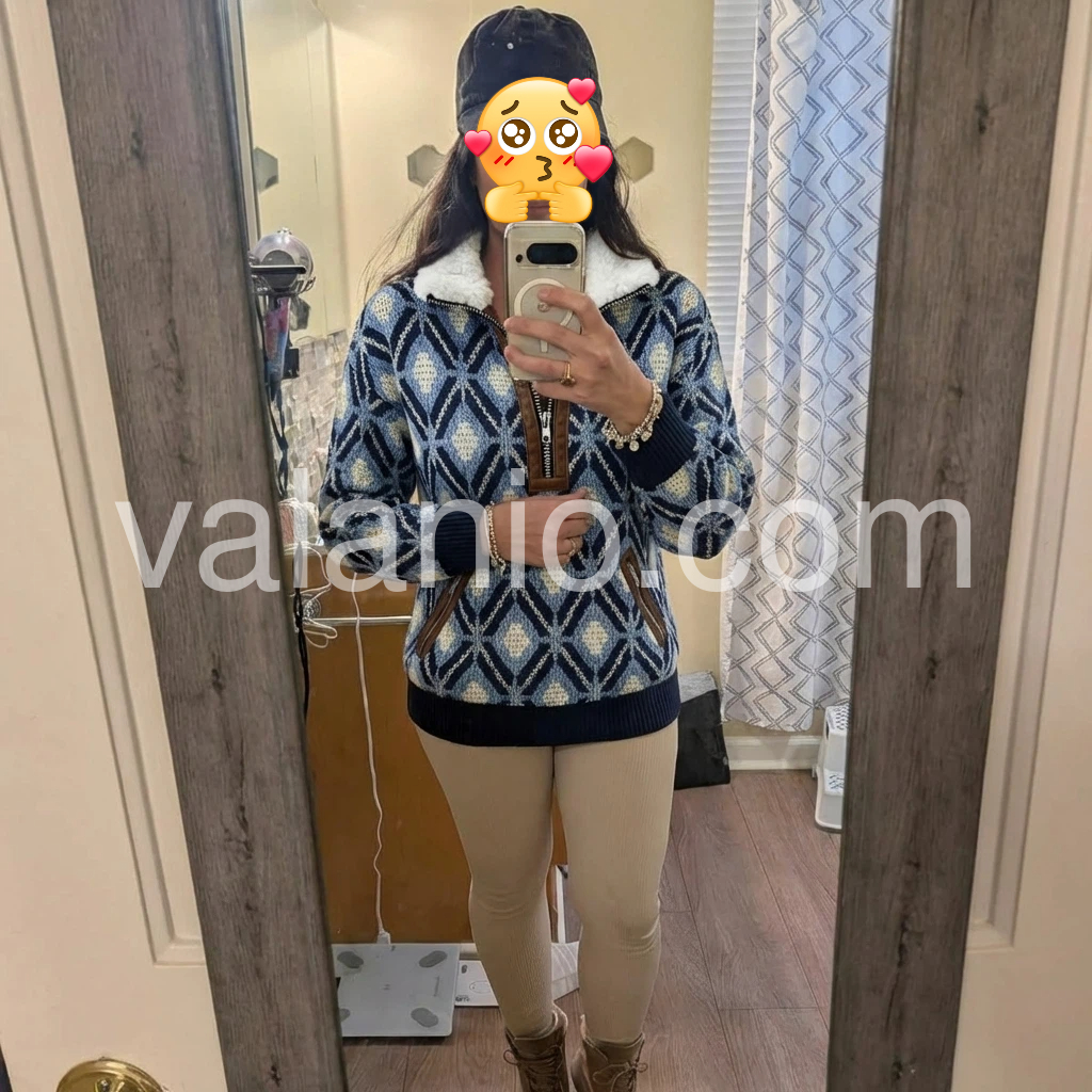 This sweater is the perfect blend of cozy and chic! The geometric pattern in shades of blue and white is so classic and timeless, and the fur collar makes it feel extra special. The leather trim on the zipper and pockets adds a nice detail that elevates the whole look. The fabric is soft and stretchy, so it’s comfortable to wear all day. I love pairing it with jeans and boots for a casual, outdoorsy look. It’s quickly become my go-to for cool weekends!