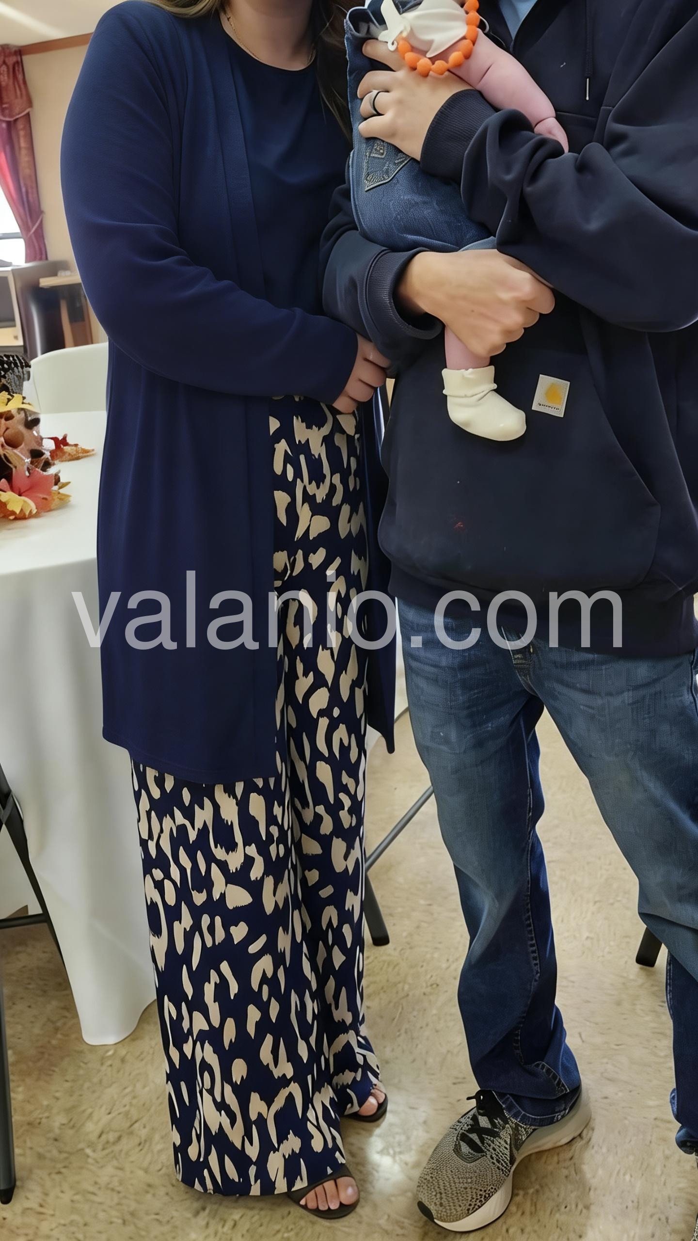 This coordinated outfit features wide-leg pants in a striking navy and cream leopard print. Paired with a matching long cardigan and solid top for a polished look. The relaxed fit offers comfort and style. Perfect for casual outings or stylish events. Effortlessly chic with a modern edge.