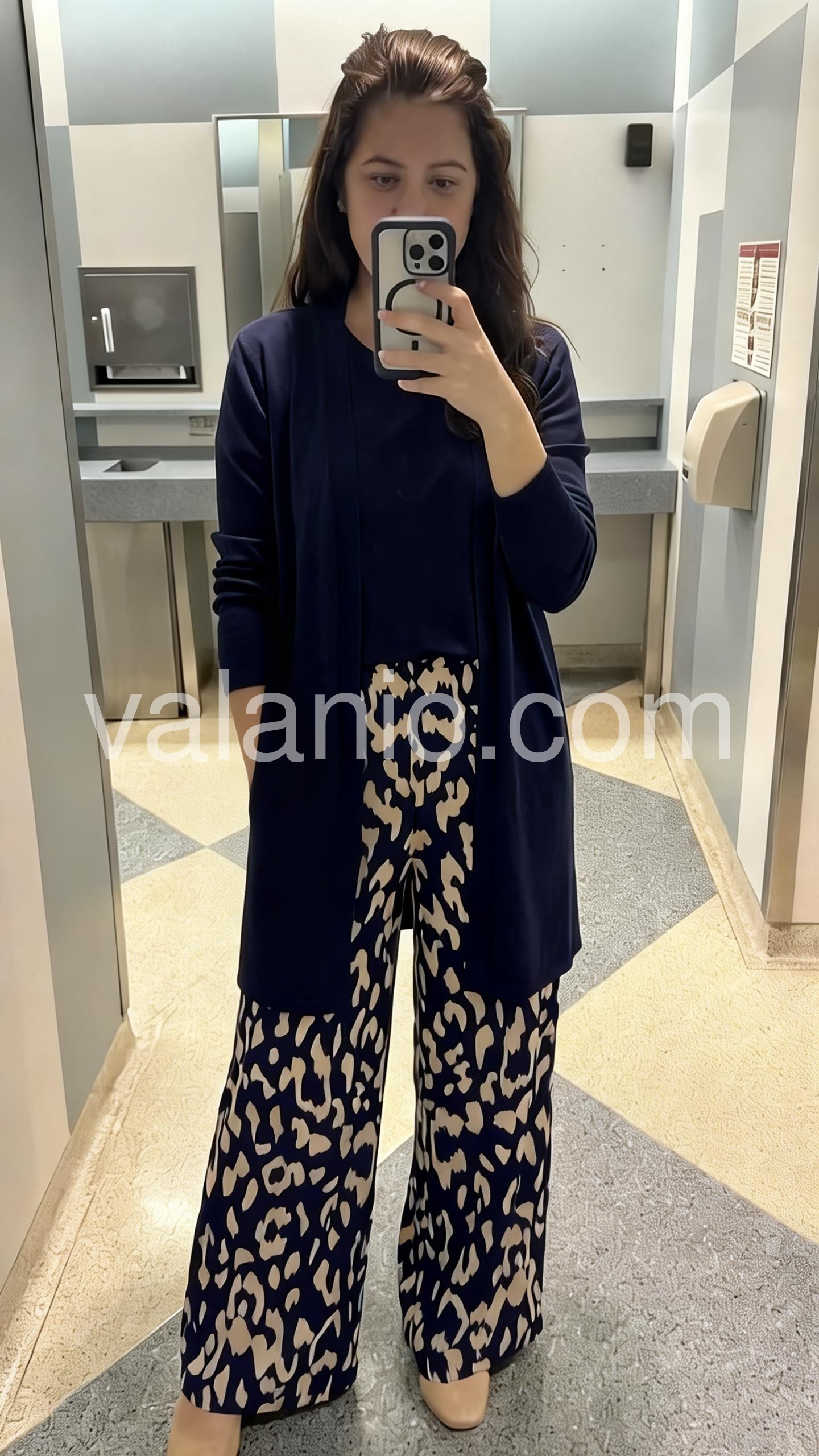 I am absolutely in love with this two piece set! The navy blue color is so rich, and the abstract leopard print on the pants is very trendy. The material is incredibly soft and flowy, making it perfect for a stylish yet comfortable look. Highly recommend!