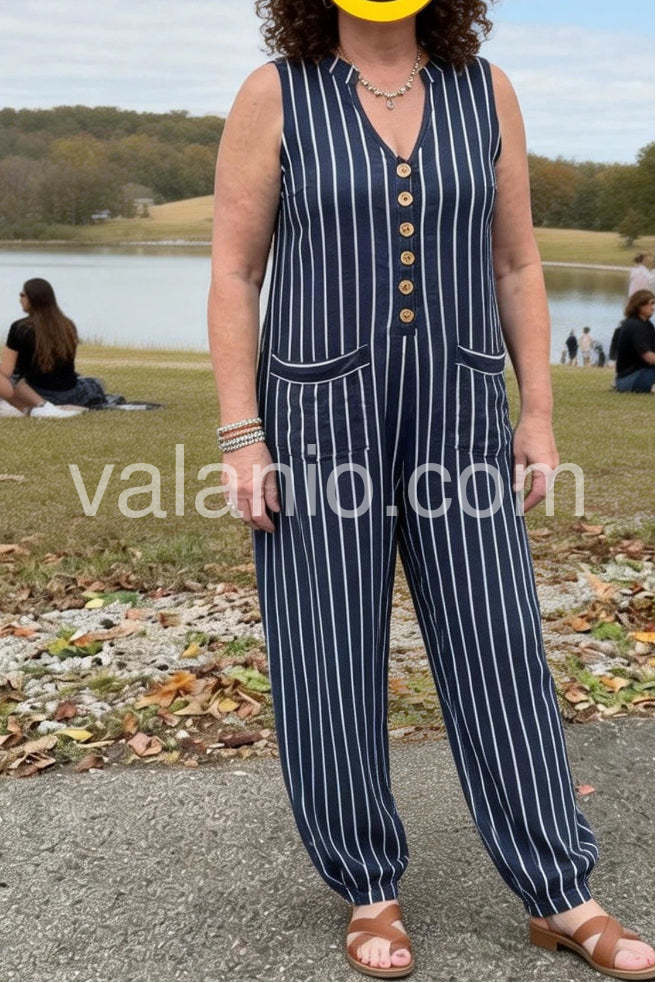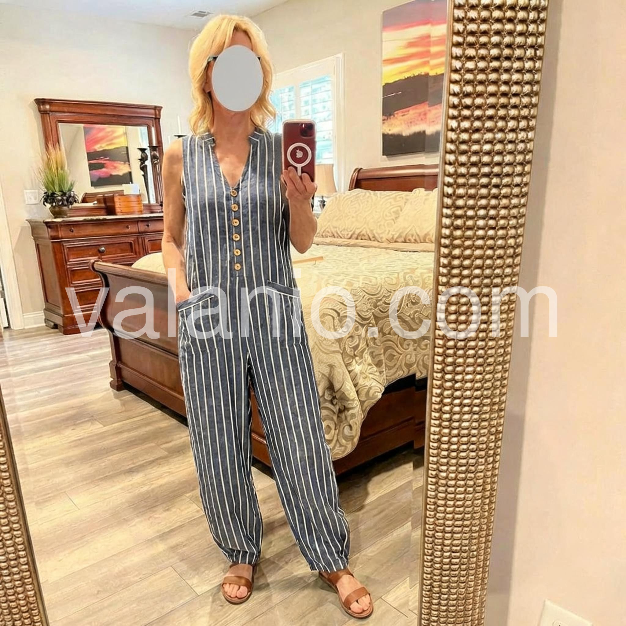 This chic sleeveless jumpsuit exudes effortless bohemian charm with its classic navy and white vertical stripes, creating a timeless and relaxed look. Crafted from lightweight, breathable fabric—likely cotton or linen blend—it’s perfect for warm weather and casual outings. The V-neckline adds a touch of femininity, while the front button closure with natural wooden buttons enhances its rustic, artisanal appeal. Featuring wide-leg, flowy pants that offer comfort and freedom of movement, this one-piece is ideal for beach days, festivals, or laid-back vacations. Two large side pockets provide both practicality and a balanced silhouette. Paired with sandals, a woven bag, and layered jewelry, it captures the essence of carefree summer style. A versatile and comfortable choice for anyone who loves fashion with a touch of boho elegance.