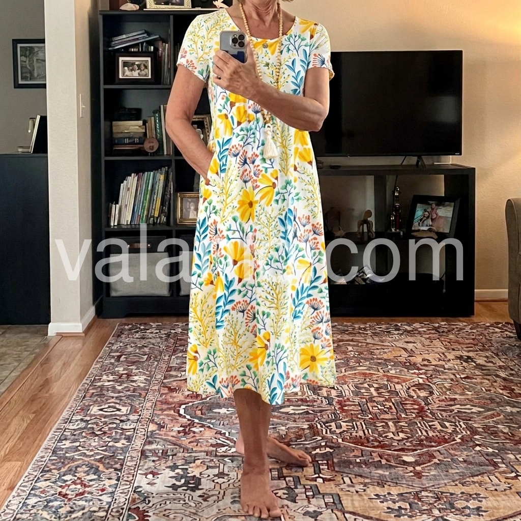 This dress solves the “cute but comfortable” everyday dilemma. The bright sunflower print feels cheerful without being overwhelming, while the relaxed A-line silhouette skims over hips and thighs. The loose fit avoids clinging to midsection areas, making it ideal for casual wear.