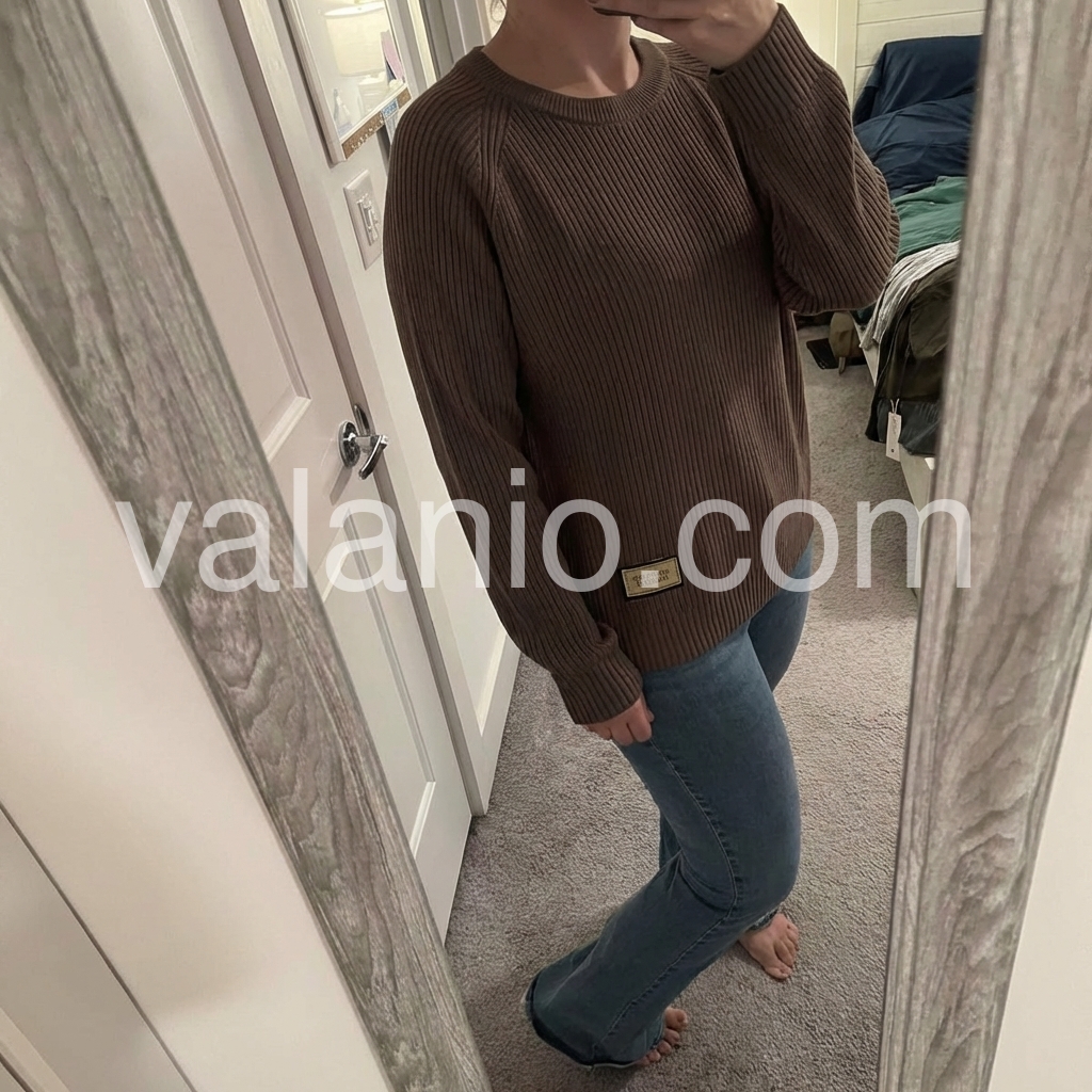 This dark brown ribbed sweater is such a wardrobe staple! I love the little \"Original Fashion\" patch detail—it gives it a casual, trendy vibe. The relaxed fit is flattering, and it pairs perfectly with jeans for everyday wear. It’s warm enough for cool days and lightweight enough for layering. I’ve gotten so many compliments already!